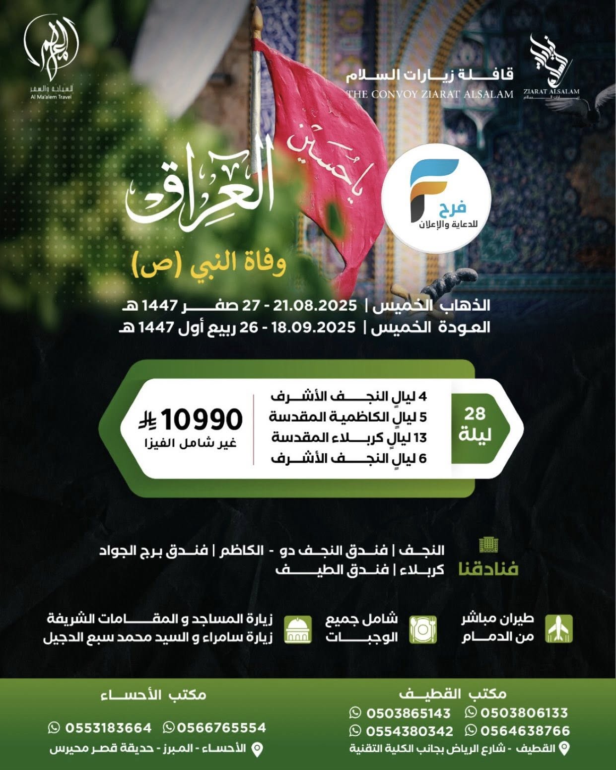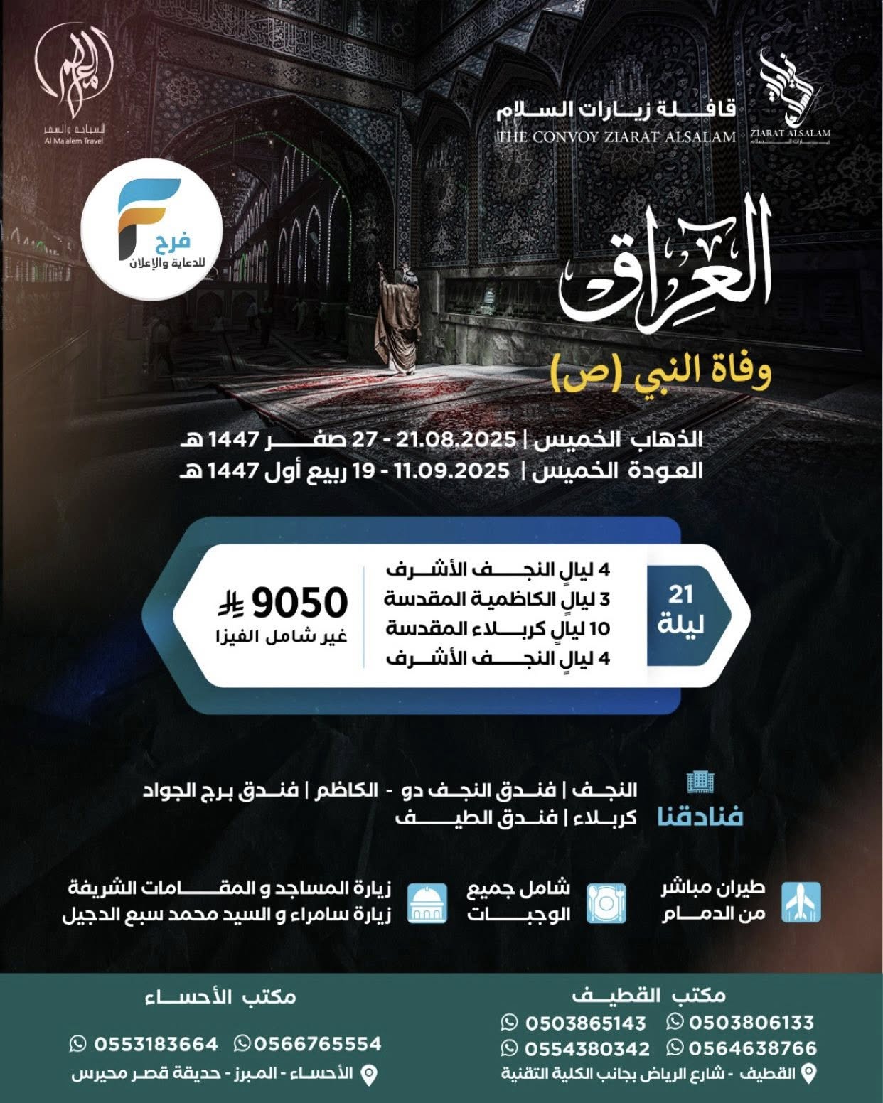 رحلات قافلة زيارات السلام وفاة النبي ص / العراق 22 يوليو، 2025 لم 30 للحجز أو الاستفسار : مكتب القطيف: 0503865143 0566149091 0566148151 0558762640 0503806133 0554380342 0564638766 0594267042 0538263916 مكتب الاحساء: 0553183664 0566765554 الانستقرام : https://www.instagram.com/ أشترك معنا في خدمة فرح : Enter the text or HTML code here شارك هذا الموضوع: النقر للمشاركة على X (فتح في نافذة جديدة) X انقر للمشاركة على فيسبوك (فتح في نافذة جديدة) فيس بوك 2888 ريال تبدأ رحلات قافلة الأمير في إجازة الربيع / العراقالتاريخ25 ديسمبر، 2018في ما يتعلق بما يأتيالعراقرحلة إضافية مكتب صاحب الحوت زيارة عرفة والغدير / العراقالتاريخ13 يونيو، 2022في ما يتعلق بما يأتيالعراق250 ريال تبدأ قيمة استخراج الفيزا العراقية الكرار / العراقالتاريخ27 يوليو، 2025في ما يتعلق بما يأتيالعراق