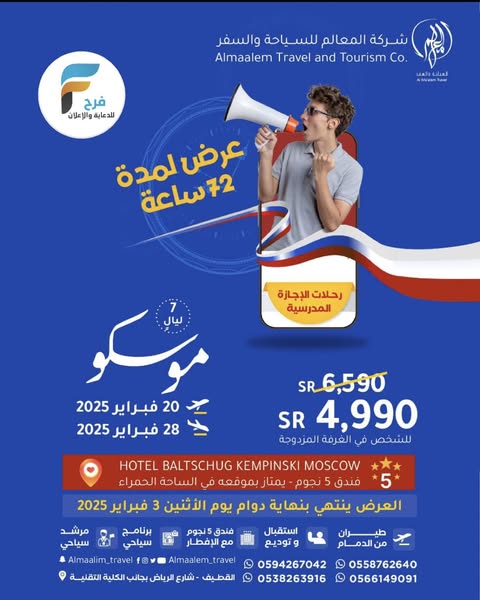 1600 ريال خصم رحلات المعالم للسياحة والسفر / روسيا 1 فبراير، 2025 لم 18 للحجز أو الاستفسار : 0594267042 0503865143 0503806133 0558762640 0554380342 0538263916 0564638766 الانستقرام : https://www.instagram.com/ أشترك معنا في خدمة فرح : Enter the text or HTML code here شارك هذا الموضوع: النقر للمشاركة على X (فتح في نافذة جديدة) X انقر للمشاركة على فيسبوك (فتح في نافذة جديدة) فيس بوك رحلة دراسية وكالة مستقبل الجيل للسفر والسياحة / مانشسترالتاريخ26 مايو، 2023في ما يتعلق بما يأتيالسفر والسياحةرحلات وكالة عشاق الرضا (ع) / كروز مصرالتاريخ15 فبراير، 2024في ما يتعلق بما يأتيالسفر والسياحةمنتجع وإستراحة تيانجين للراحة والإسترخاء والمناسبات بأم الحمام للإيجار اليوميالتاريخ23 يناير، 2020في ما يتعلق بما يأتيالحج