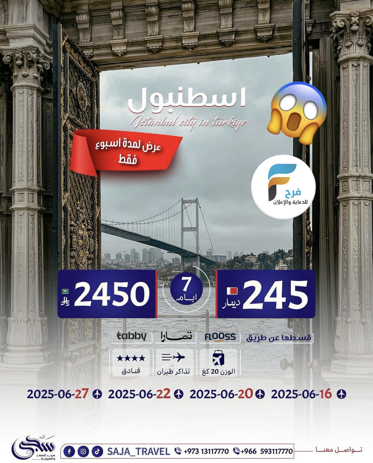 2450 ريال عرض رحلة سجى للسفر والسياحة / تركيا 9 يونيو، 2025 8 للحجز والإستفسار : السعودية :- 0593117770 البحرين :- 0097313117770 0097332111565 ♦ الانستقرام :- saja_travel أشترك معنا في خدمة فرح : Enter the text or HTML code here شارك هذا الموضوع: النقر للمشاركة على X (فتح في نافذة جديدة) X انقر للمشاركة على فيسبوك (فتح في نافذة جديدة) فيس بوك أشترك معنا الأن في خدمة المجتمع الوتسابي لعروض السفر مع وكالة سجى للسفر والسياحةالتاريخ3 سبتمبر، 2024في ما يتعلق بما يأتيالسفر والسياحة2435 ريال عرض خاص للبنات من رفيق الدرب للسفر والسياحة / مصرالتاريخ15 يناير، 2020في ما يتعلق بما يأتيالسفر والسياحةمددنا عرض الرحلة من وكالة البحار للسفر والسياحة / جورجياالتاريخ12 نوفمبر، 2020في ما يتعلق بما يأتيالسفر والسياحة
