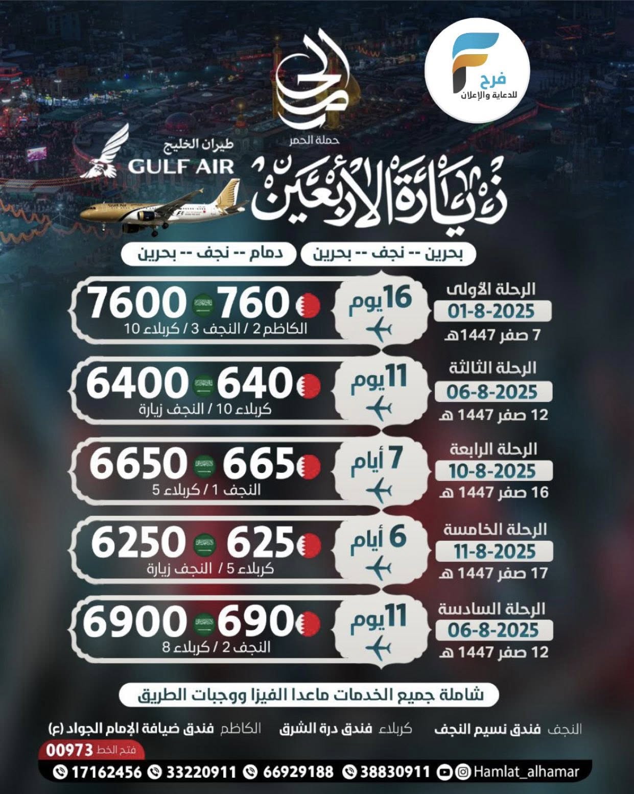 فرصة 6 أيام تبدأ رحلات حملة الحمر ما قبل الأربعين وزيارة الأربعين / العراق 21 يوليو، 2025 11 للحجز والاستفسار :- 0097366929188 0097333220911 0097338830911 0097317162456 انستقرام: www.instagram.com أشترك معنا في خدمة فرح : Enter the text or HTML code here شارك هذا الموضوع: النقر للمشاركة على X (فتح في نافذة جديدة) X انقر للمشاركة على فيسبوك (فتح في نافذة جديدة) فيس بوك