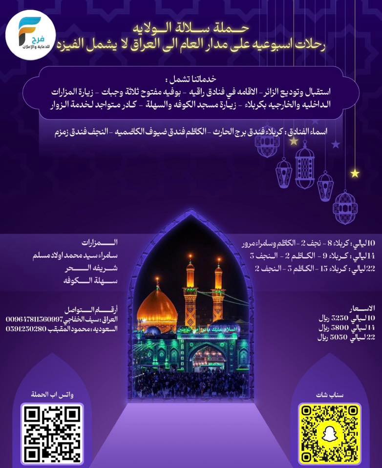 3250 ريال تبدأ رحلات حملة سلالة الولاية / العراق 2 فبراير، 2026 1 للحجز والإستفسار : ابو سجاد0591250280 سيف ابو عباس009647811360997 أشترك معنا في خدمة فرح :