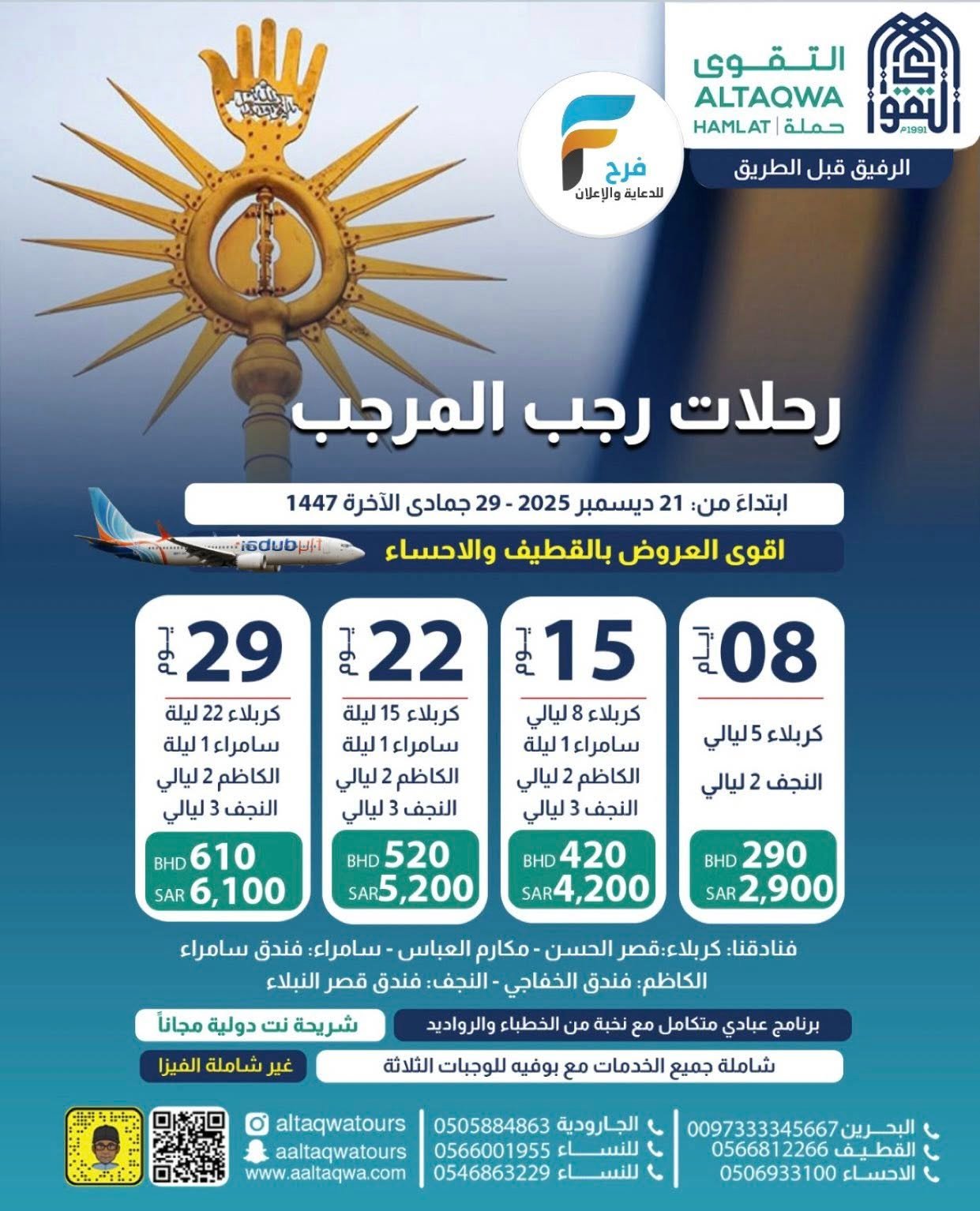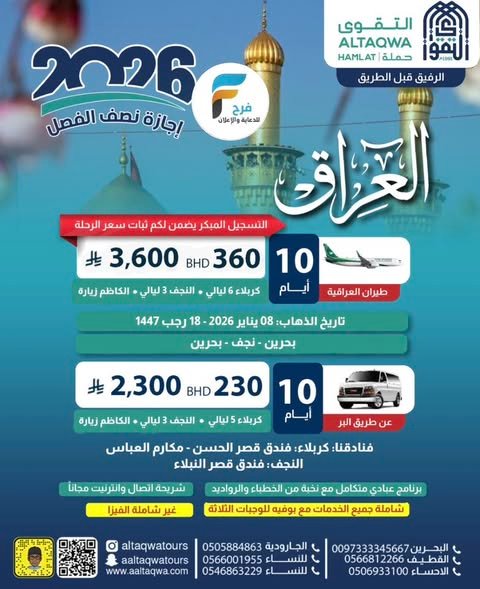 2300 ريال تبدأ رحلات الحافلات والطيران التقوى للسفر والسياحة شهري رجب وشعبان / العراق 5 ديسمبر، 2025 525/08/14 للحجز أو الاستفسار :- القطيف:0566812266 الإنستقرام :-www.instagram.com أشترك معنا في خدمة فرح : شارك هذا الموضوع: النقر للمشاركة على X (فتح في نافذة جديدة) X انقر للمشاركة على فيسبوك (فتح في نافذة جديدة) فيس بوك رحلة إضافية مكتب صاحب الحوت زيارة عرفة والغدير / العراقالتاريخ13 يونيو، 2022في ما يتعلق بما يأتيالعراق250 ريال تبدأ قيمة استخراج الفيزا العراقية الكرار / العراقالتاريخ27 يوليو، 2025في ما يتعلق بما يأتيالعراقيتوفر لدينا سويتات لعرفة ومحرم / العراقالتاريخ14 يونيو، 2024في ما يتعلق بما يأتيالعراق