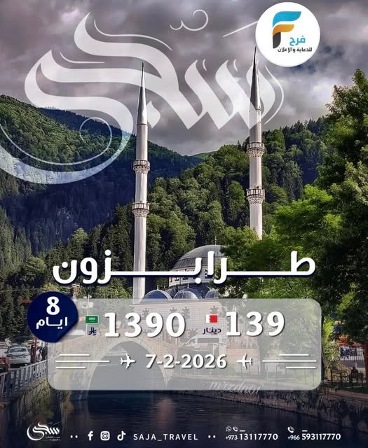 1390 ريال فقط عرض ما يتفوت رحلة سجى للسفر والسياحة / تركيا 4 فبراير، 2026 51 للحجز والإستفسار : السعودية :- 0593117770 البحرين :- 0097313117770 0097332111565 ♦ الانستقرام :-saja_travel أشترك معنا في خدمة فرح :