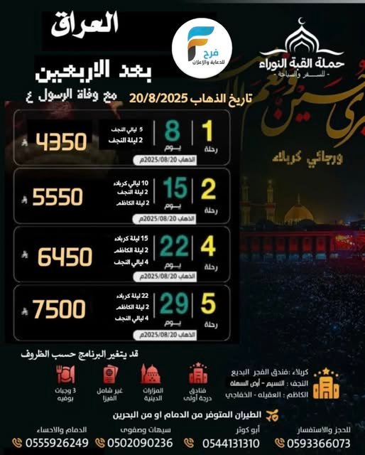 4350 ريال تبدأ رحلات حملة القبة النوراء ما بعد الأربعين ووفاة النبي ص / العراق 13 أغسطس، 2025 2 🎆 للحجز والإستفسار : 🎆 أم سيد نور 📱0593366073 أبو الكوثر: 📱0544131310 سيهات وصفوى: 📱0502090236 الدمام والأحساء: 📱0555926249 📱0542145337 المكتب: 📱0138204781 أشترك معنا في خدمة فرح : شارك هذا الموضوع: النقر للمشاركة على X (فتح في نافذة جديدة) X انقر للمشاركة على فيسبوك (فتح في نافذة جديدة) فيس بوك