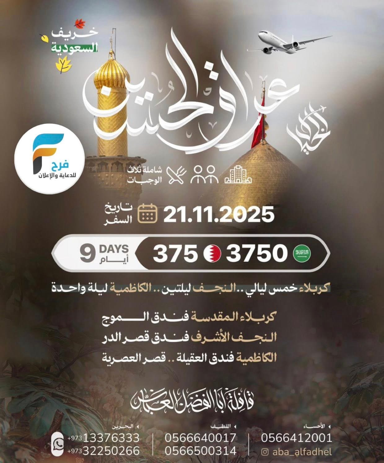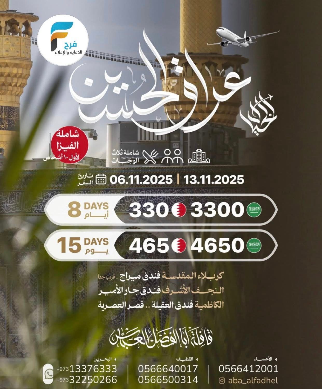 2200 ريال تبدأ رحلات الحافلات والطيران قافلة ابا الفضل العباس / العراق 23 أكتوبر، 2025 525/09/09 للحجز أو الاستفسار : القطيف: 0558335297 0566500314 0566640017 0544696477 0566285623 الاحساء: 0566412001 0501908993 البحرين:0097313376333 0097332250266 انستغرام : Aba_alfadhel فيس بوك / قافلة ابا الفضل العباس سناب / https://www.snapchat.com أشترك معنا في خدمة فرح : شارك هذا الموضوع: النقر للمشاركة على X (فتح في نافذة جديدة) X انقر للمشاركة على فيسبوك (فتح في نافذة جديدة) فيس بوك