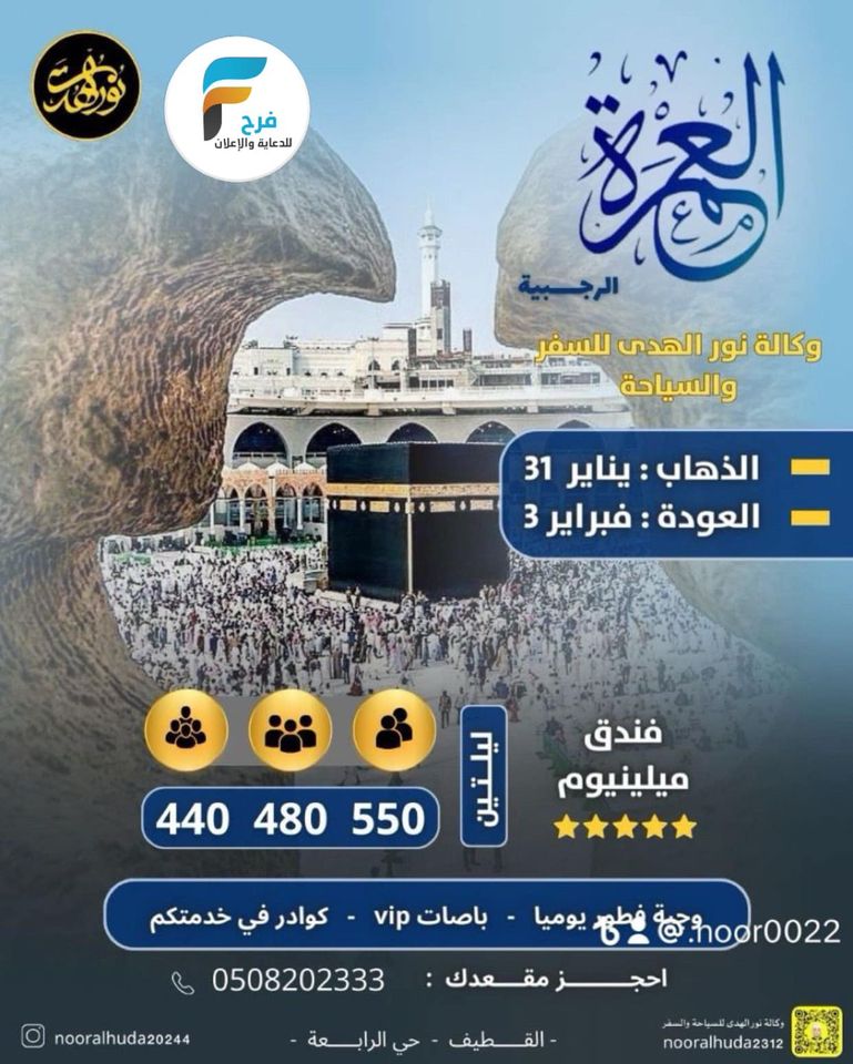 440 ريال تبدأ رحلات وكالة نور الهدى للسفر والسياحة / العمرة الرجبية 29 يناير، 2024 1 للحجز أو الاستفسار : 0508202333 انستقرام : https://www.instagram.com أشترك معنا في خدمة فرح : Enter the text or HTML code here شارك هذا الموضوع: النقر للمشاركة على X (فتح في نافذة جديدة) X انقر للمشاركة على فيسبوك (فتح في نافذة جديدة) فيس بوك