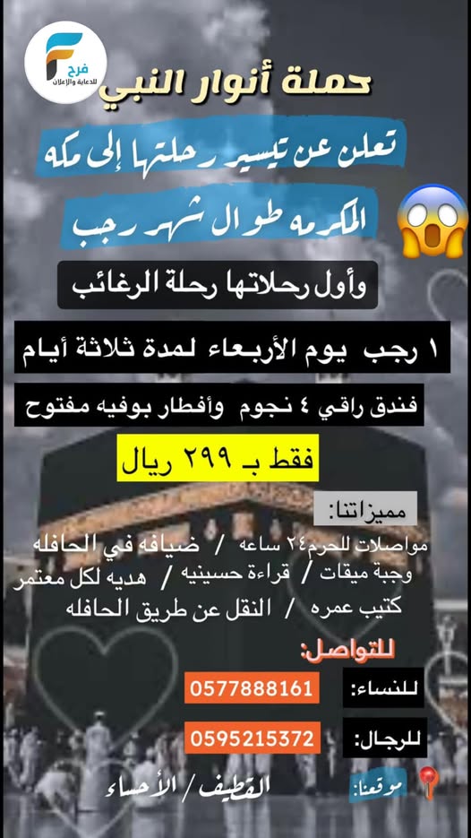 299 ريال فقط رحلة حملة أنوار النبي ص / العمرة الرجبية 24 ديسمبر، 2024 2 للحجز و الاستفسار : 0577888161 0595215372 أشترك معنا في خدمة فرح : Enter the text or HTML code here شارك هذا الموضوع: النقر للمشاركة على X (فتح في نافذة جديدة) X انقر للمشاركة على فيسبوك (فتح في نافذة جديدة) فيس بوك