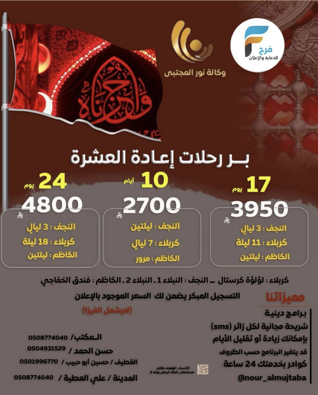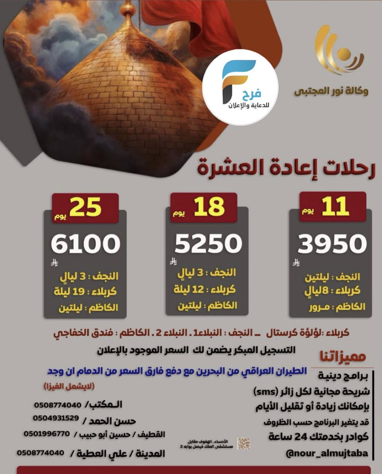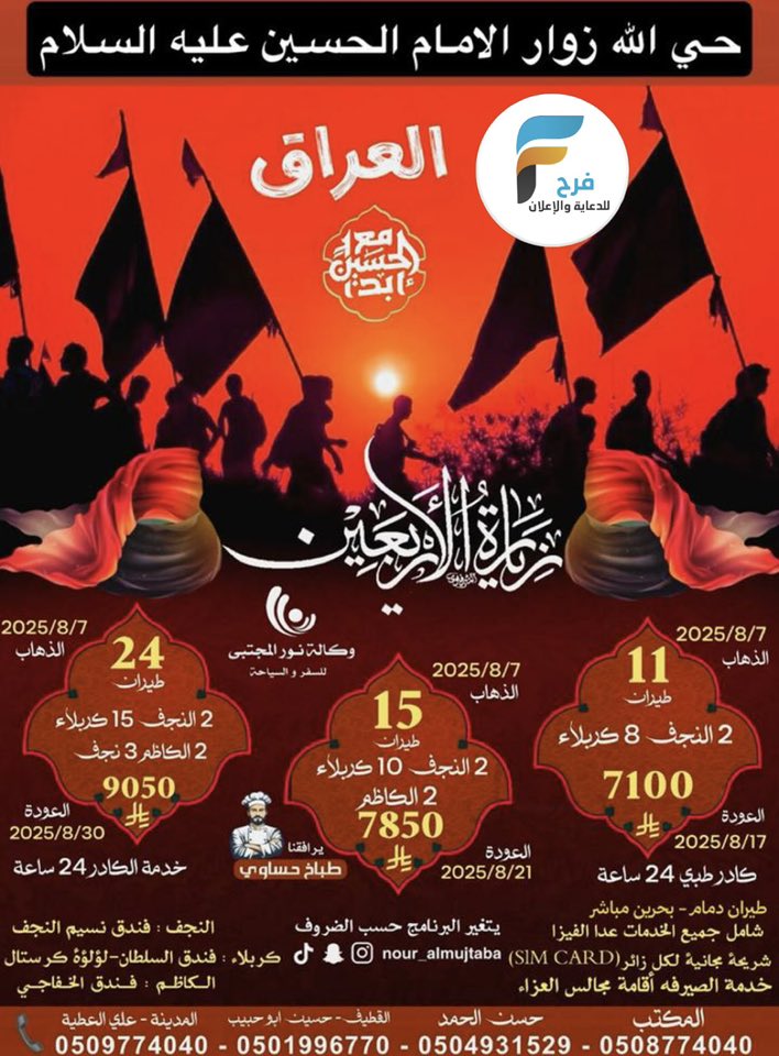 2700 ريال رحلات وكالة نور المجتبى إعادة العشرة وزيارة الأربعين/ العراق 10 يوليو، 2025 2 للحجز و الإستفسار : 0508774040 0504931529 0542849666 0501996770 0509774040 حسابات السوشل ميديا Nour_Almujtaba أشترك معنا في خدمة فرح : Enter the text or HTML code here شارك هذا الموضوع: النقر للمشاركة على X (فتح في نافذة جديدة) X انقر للمشاركة على فيسبوك (فتح في نافذة جديدة) فيس بوك 2650 ريال رحلات وكالة نور المجتبى عشرة محرم وإعادة العشرة / العراقالتاريخ26 يونيو، 2025في ما يتعلق بما يأتيالعراق2700 ريال تبدأ ورحلات الحافلات والطيران وكالة النجمة المميزة قبل الأربعين وزيارة الأربعين / العراقالتاريخ24 يوليو، 2025في ما يتعلق بما يأتيالعراق3995 ريال تبدأ رحلات وكالة انوار الهدى إعادة العشرة وزيارة الأربعين / العراقالتاريخ10 يوليو، 2025في ما يتعلق بما يأتيالعراق