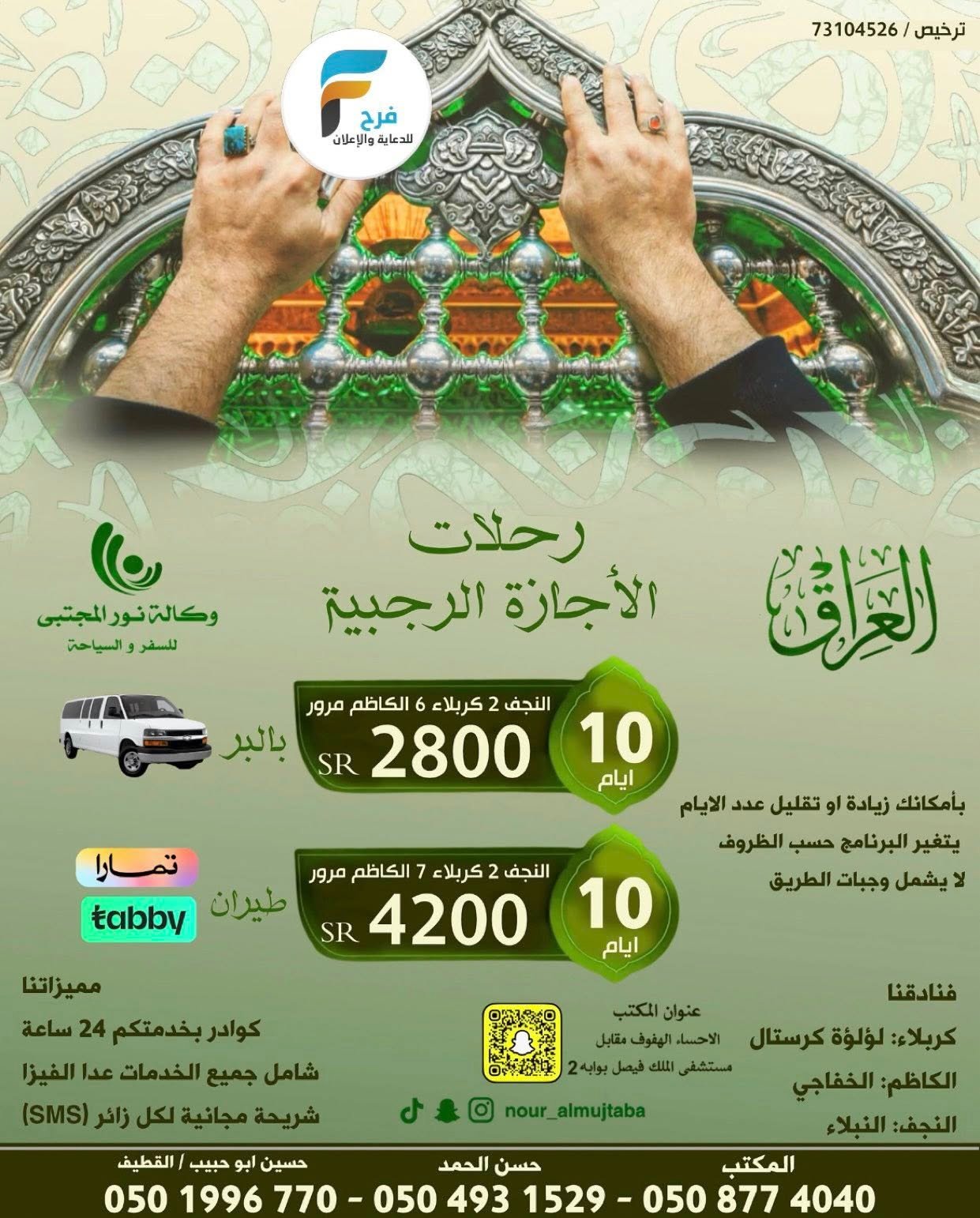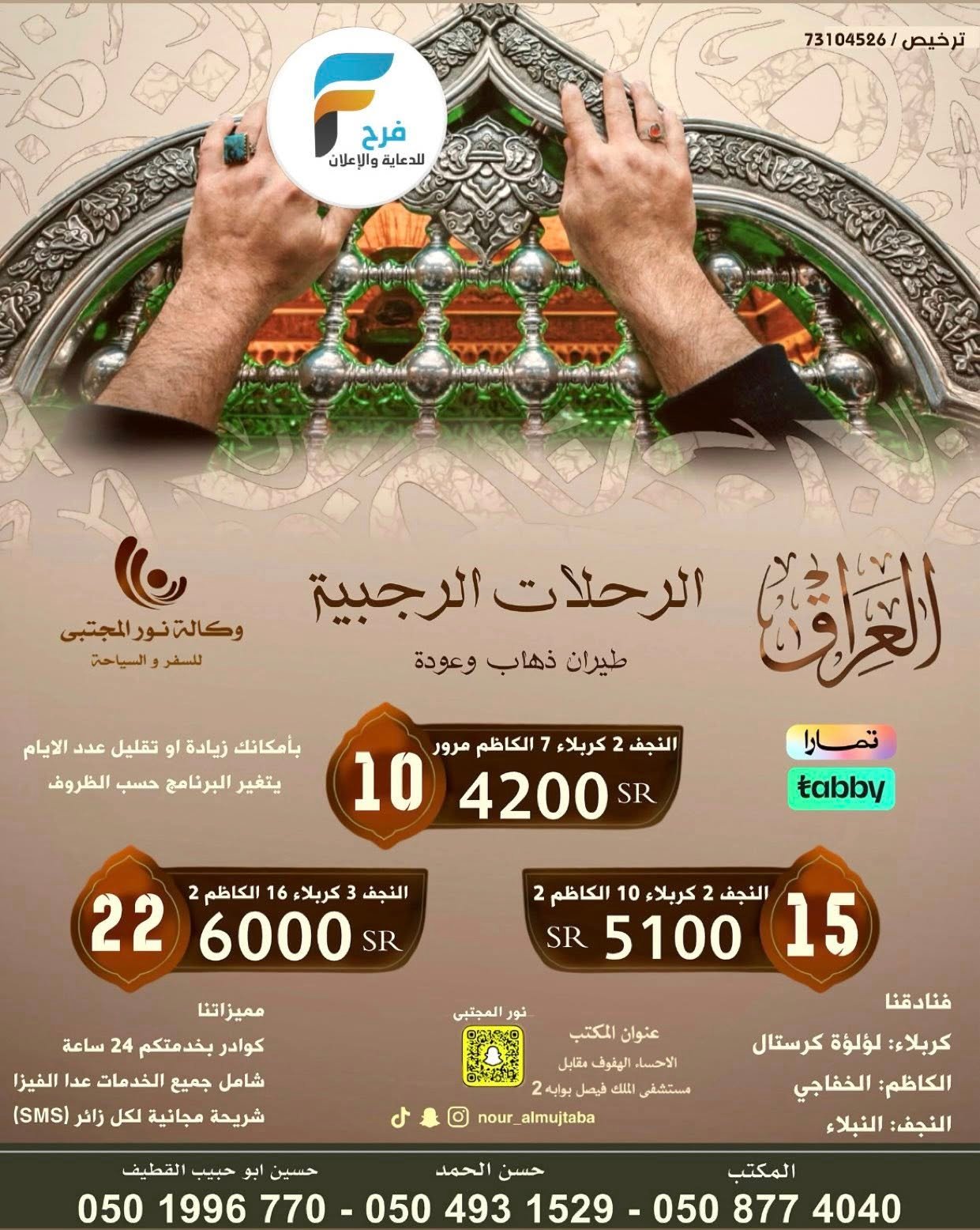 1450 ريال رحلات الطيران وكالة نور المجتبى الأسبوعية / العمرة الرجبية – العراق