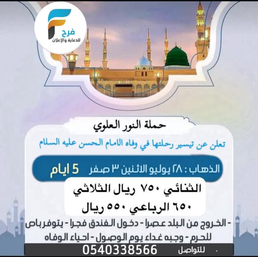 550 ريال تبدأ رحلات حملة النور العلوي وفاة الامام الحسن ع / المدينة المنورة 21 يوليو، 2025 1 للحجز و الإستفسار:- 0540338566 أشترك معنا في خدمة فرح : Enter the text or HTML code here شارك هذا الموضوع: النقر للمشاركة على X (فتح في نافذة جديدة) X انقر للمشاركة على فيسبوك (فتح في نافذة جديدة) فيس بوك 240 ريال سكن من حملة خدر زينب ع / المدينة المنورةالتاريخ7 يونيو، 2019في ما يتعلق بما يأتيالمدينة المنورة / حملات الإحساء680 ريال تبدأ رحلات الحافلات والطيران حملة أبو السجاد إجازة الفصل الأول / المدينة المنورة – العراقالتاريخ19 أكتوبر، 2024في ما يتعلق بما يأتيالعراقخصم 50 ريال من قافلة انوار الايمان رحلة وفاة النبي ص / المدينة المنورةالتاريخ2 نوفمبر، 2018في ما يتعلق بما يأتيالمدينة المنورة / حملات الإحساء