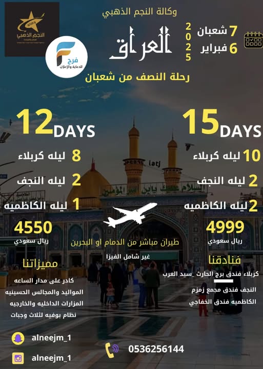4550 ريال تبدأ رحلات وكالة النجم الذهبي للسفر والسياحة النصف من شعبان / العراق 16 يناير، 2025 1 للحجز والاستفسار : 0536256144 الإنستقرام : www.instagram.com سناب شات : www.snapchat.com أشترك معنا في خدمة فرح : Enter the text or HTML code here شارك هذا الموضوع: النقر للمشاركة على X (فتح في نافذة جديدة) X انقر للمشاركة على فيسبوك (فتح في نافذة جديدة) فيس بوك 2888 ريال تبدأ رحلات قافلة الأمير في إجازة الربيع / العراقالتاريخ25 ديسمبر، 2018في ما يتعلق بما يأتيالعراقرحلة إضافية مكتب صاحب الحوت زيارة عرفة والغدير / العراقالتاريخ13 يونيو، 2022في ما يتعلق بما يأتيالعراق250 ريال تبدأ قيمة استخراج الفيزا العراقية الكرار / العراقالتاريخ27 يوليو، 2025في ما يتعلق بما يأتيالعراق