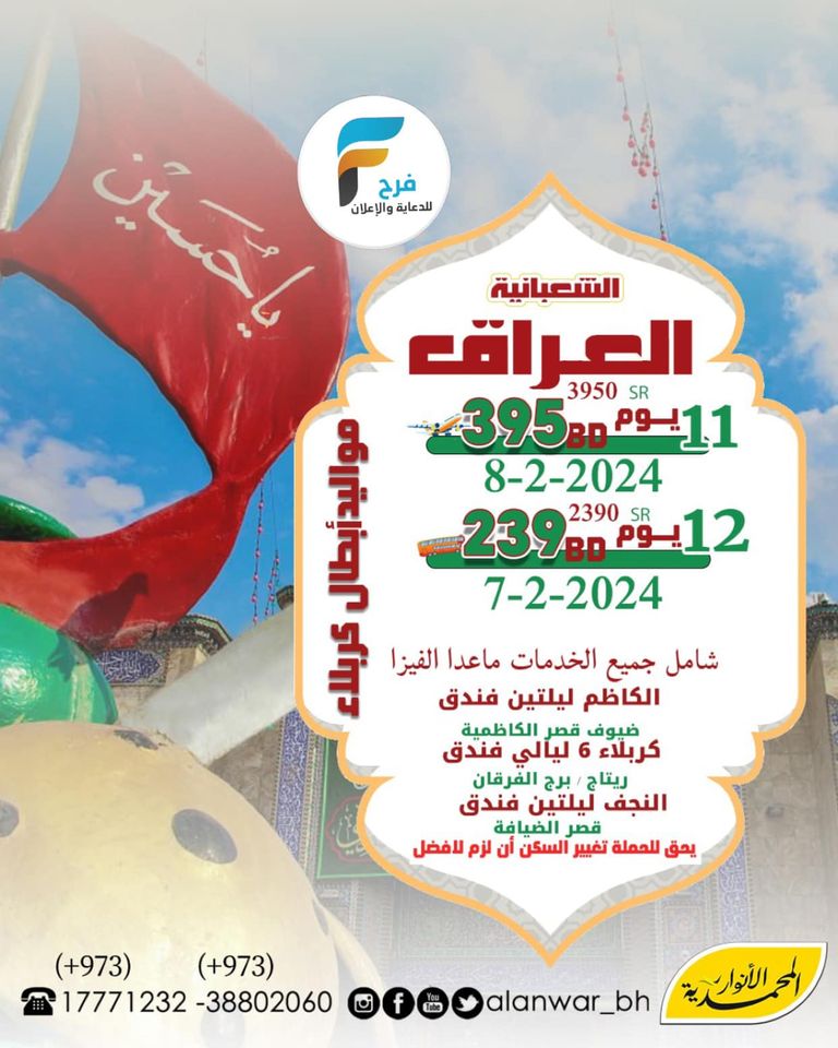 2390 ريال 12 يوم رحلات الأنوار المحمدية مواليد أبطال كربلاء / العراق 1 فبراير، 2024 2 للحجز والإستفسار : 0097317771232 0097338802060 الانستقرام :- www.instagram.com أشترك معنا في خدمة فرح : Enter the text or HTML code here شارك هذا الموضوع: النقر للمشاركة على X (فتح في نافذة جديدة) X انقر للمشاركة على فيسبوك (فتح في نافذة جديدة) فيس بوك
