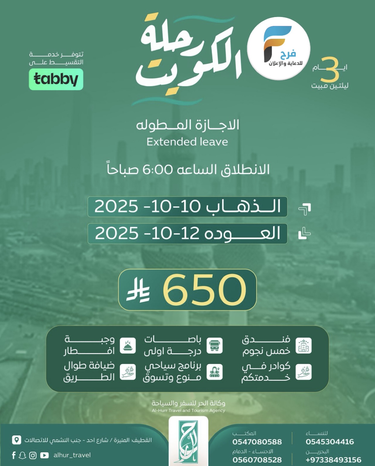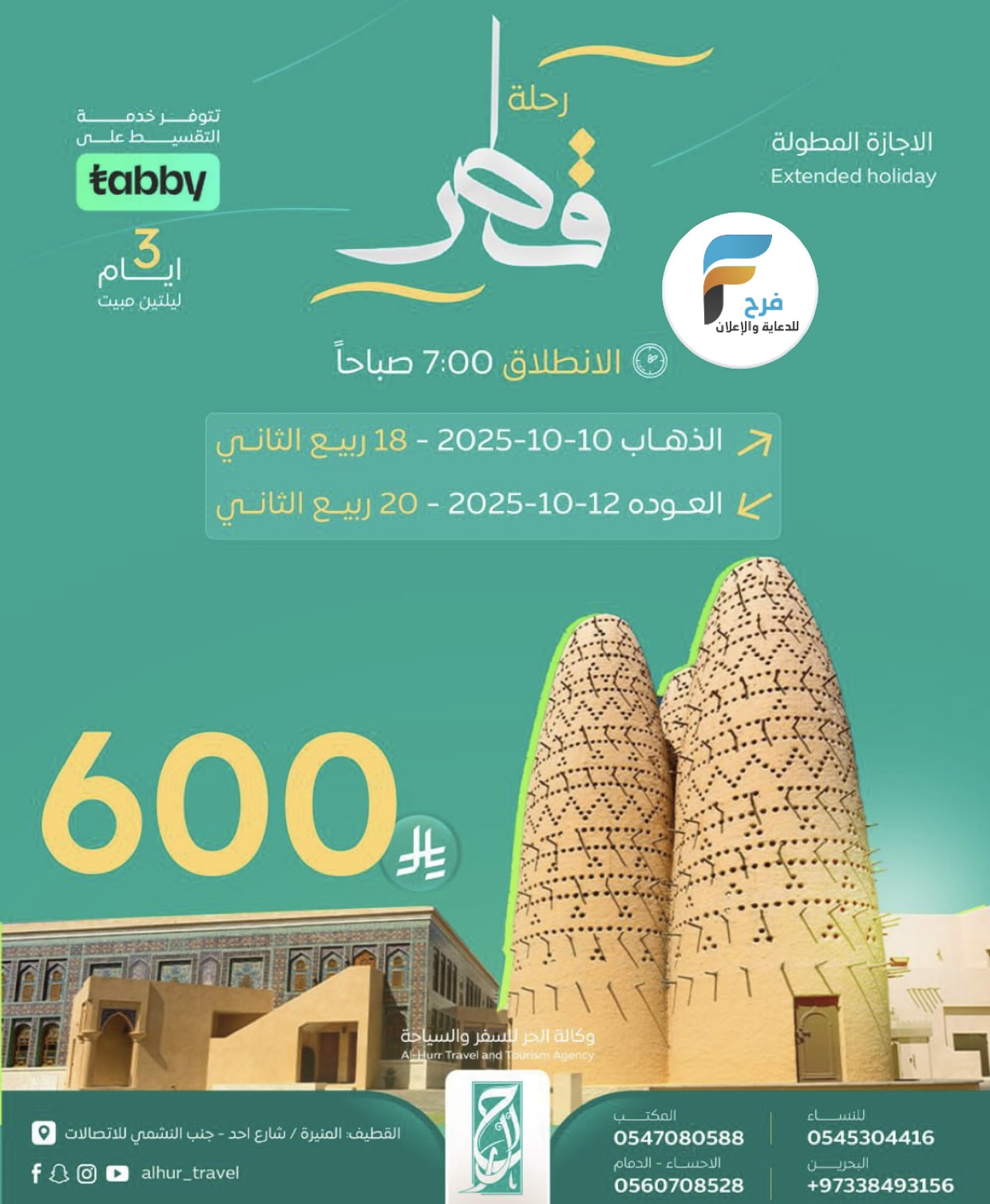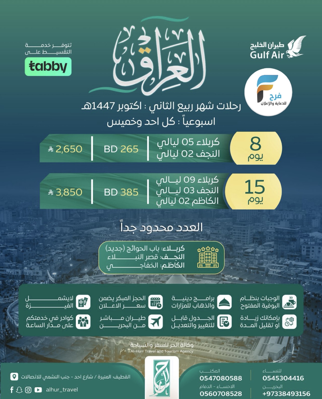 600 ريال تبدأ رحلات وكالة الحر الإجازة المطولة / قطر _ الكويت _ العراق 1 أكتوبر، 2025 925/10/01 للحجز أو الاستفسار : 0547080588 0545304416 0560708528 0097338493156 انستغرام :www.instgram.com سناب :www.snapchat.com أشترك معنا في خدمة فرح : Enter the text or HTML code here شارك هذا الموضوع: النقر للمشاركة على X (فتح في نافذة جديدة) X انقر للمشاركة على فيسبوك (فتح في نافذة جديدة) فيس بوك 2888 ريال تبدأ رحلات قافلة الأمير في إجازة الربيع / العراقالتاريخ25 ديسمبر، 2018في ما يتعلق بما يأتيالعراقرحلة إضافية مكتب صاحب الحوت زيارة عرفة والغدير / العراقالتاريخ13 يونيو، 2022في ما يتعلق بما يأتيالعراق250 ريال تبدأ قيمة استخراج الفيزا العراقية الكرار / العراقالتاريخ27 يوليو، 2025في ما يتعلق بما يأتيالعراق