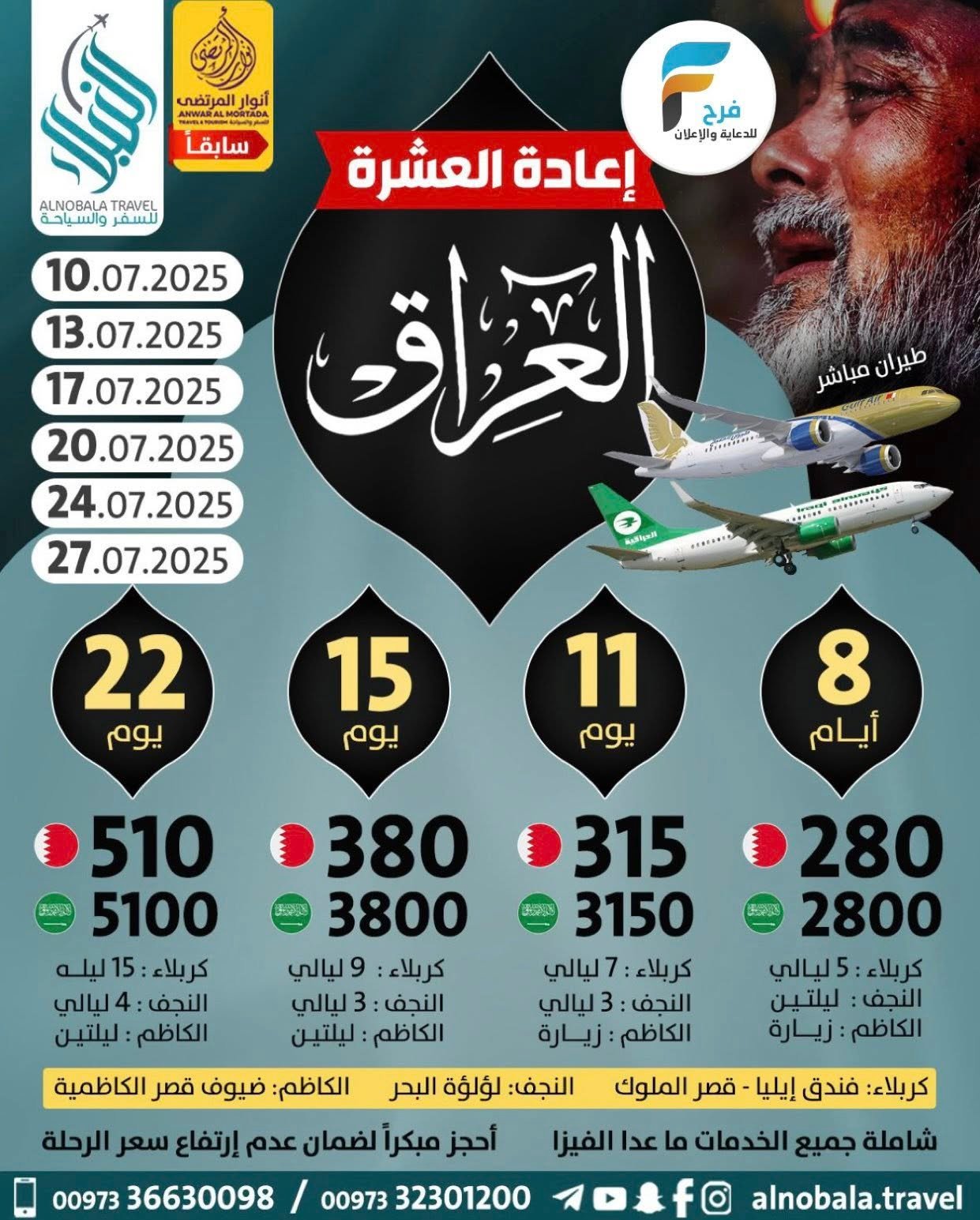 900 ريال تبدأ رحلات الحافلات والطيران النبلاء إعادة العشرة وزيارة الأربعين / العراق 3 يوليو، 2025 10 للحجز و الاستفسار : 0097332301200 0097336630098 : الانستقرام https://www.instagram.com/ أشترك معنا في خدمة فرح : شارك هذا الموضوع: النقر للمشاركة على X (فتح في نافذة جديدة) X انقر للمشاركة على فيسبوك (فتح في نافذة جديدة) فيس بوك