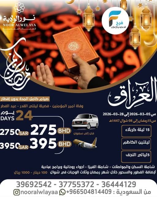 2750 ريال تبدأ رحلات الحافلات والطيران نور الولاية شهر رمضان وعيد الفطر / العراق 30 يناير، 2026 1 للحجز والإستفسار : 0097339692542 0097337755372 0097336444129 الانستقرام :- https://www.instagram.com أشترك معنا في خدمة فرح :