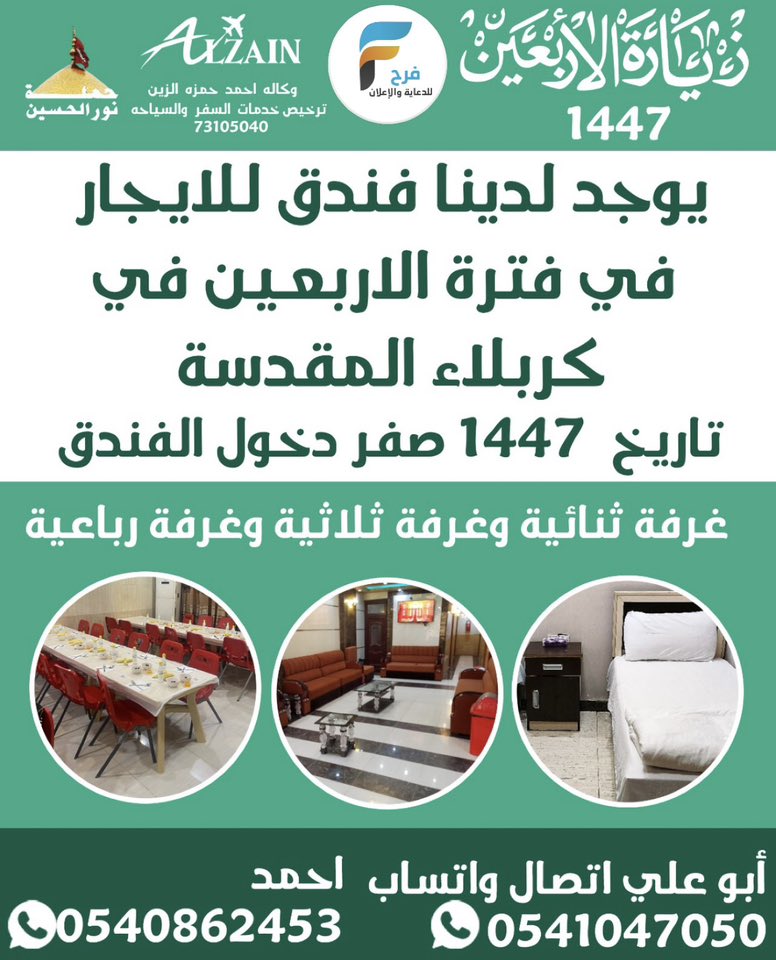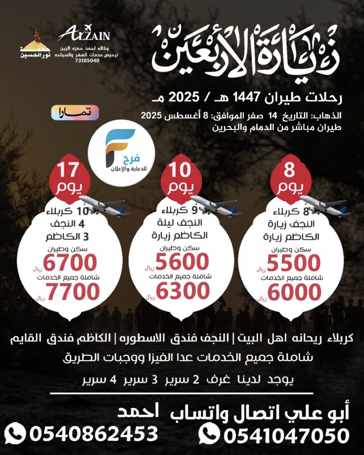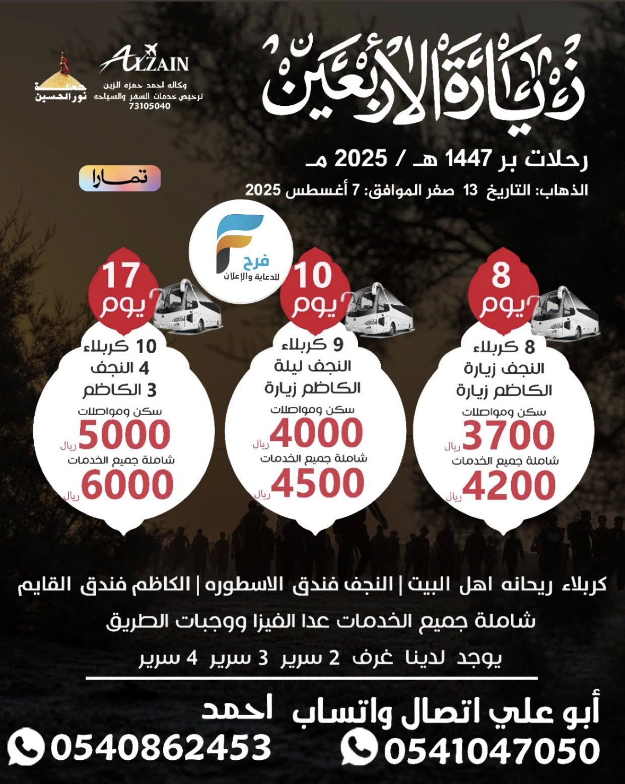 رحلات الحافلات والطيران حملة نور الحسين زيارة الأربعين كما يتوفر لدينا سكن فندقي / العراق 14 يوليو، 2025 1 للحجز أو الاستفسار:- 0541047050 0540862453 أشترك معنا في خدمة فرح : Enter the text or HTML code here شارك هذا الموضوع: النقر للمشاركة على X (فتح في نافذة جديدة) X انقر للمشاركة على فيسبوك (فتح في نافذة جديدة) فيس بوك معجب بهذه:إعجاب تحميل... مرتبط