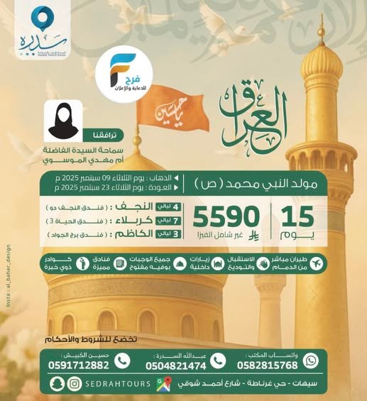 رحلة السدرة للسفر والسياحة مولد النبي ص / العراق 19 أغسطس، 2025 1للحجز أو الاستفسار :واتساب المكتب 0582815768عبدالله السدرة 0504821474حسين الكبيش 0591712882الانستقرام www.instagram.com/taamalslamأشترك معنا في خدمة فرح :