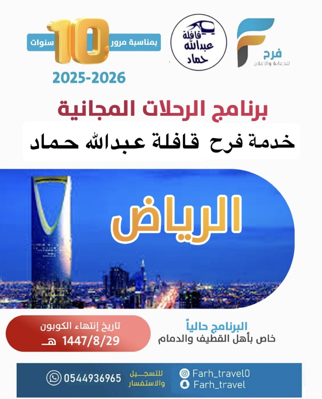 بمناسبة مرور سـ10ـنوات على خدمة فرح وقافلة عبدالله حماد سجل وكن أحد الرابحين في برنامج الرحلات المجانية 13 أكتوبر، 2025 إستمارة التسجيل :- 👇🏻 👈🏻 أضغط هنا 👉🏻 ملاحظة هامة ستعلن أسماء الفائزين على فترات من خلال حسابات خدمة فرح 👇🏻👇🏻👇🏻👇🏻👇🏻👇🏻👇🏻👇🏻 حسابات خدمة فرح :- Enter the text or HTML code here شارك هذا الموضوع: النقر للمشاركة على X (فتح في نافذة جديدة) X انقر للمشاركة على فيسبوك (فتح في نافذة جديدة) فيس بوك معجب بهذه:إعجاب تحميل... مرتبط