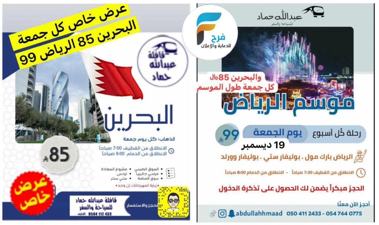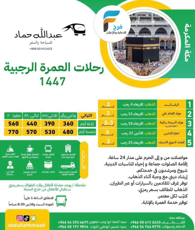85 ريال تبدأ رحلات وكالة عبدالله حماد / العمرة الرجبية – الرياض – البحرين 15 ديسمبر، 2025 للحجز و الاستفسار : عبدالله حماد:0504112433 للنساء:0547440775 تاروت سيد حسين :0501919816 : سناب شات https://www.snapchat.com : الانستقرام https://www.instagram.com أشترك معنا في خدمة فرح : شارك هذا الموضوع: النقر للمشاركة على X (فتح في نافذة جديدة) X انقر للمشاركة على فيسبوك (فتح في نافذة جديدة) فيس بوك معجب بهذه:إعجاب تحميل... مرتبط