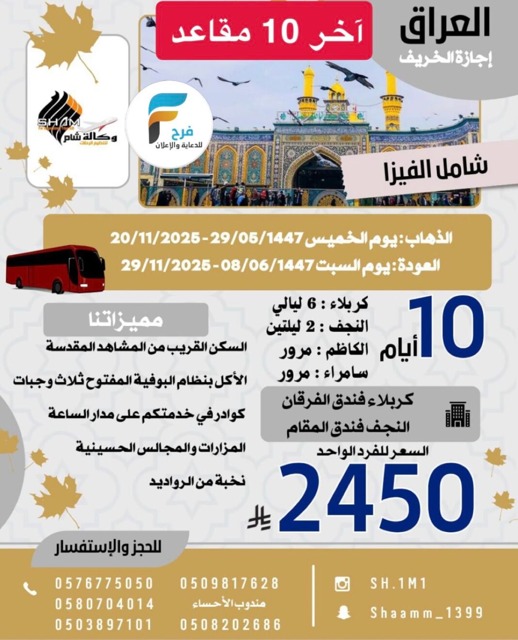 آخر المقاعد رحلات وكالة شام إجازة الخريف / العراق 5 نوفمبر، 20254 25/08/16للحجز والاستفسار :من القطيف 0576775050058070401405038971010509817628من الأحساء 0508202686الانستقرام : https://www.instagram.com/سناب شات: www.snapchat.comأشترك معنا في خدمة فرح :