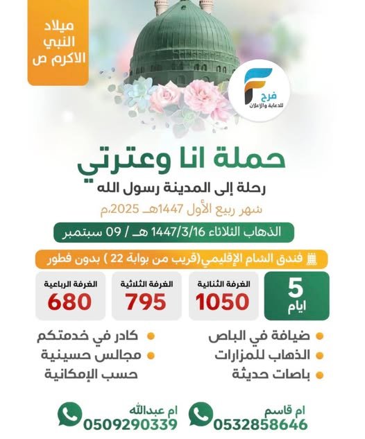680 ريال تبدأ رحلات حملة انا وعترتي مولد النبي ص / المدينة المنورة 27 أغسطس، 20252للحجز و الاستفسار : ام قاسم 0532858646ام عبدالله 0509290339أشترك معنا في خدمة فرح :