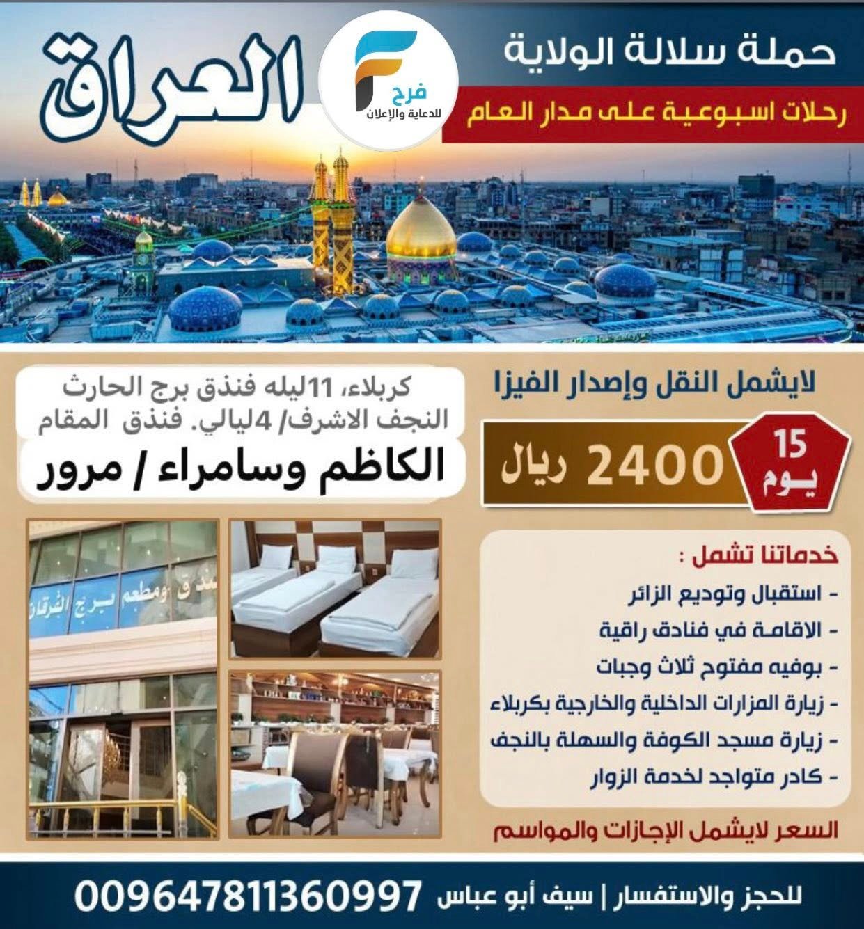 1500 ريال تبدأ أسعار الغرف الفندقية حملة سلالة الولاية / العراق 4 سبتمبر، 20252للحجز والإستفسار :سيف ابو عباس009647811360997 أشترك معنا في خدمة فرح :