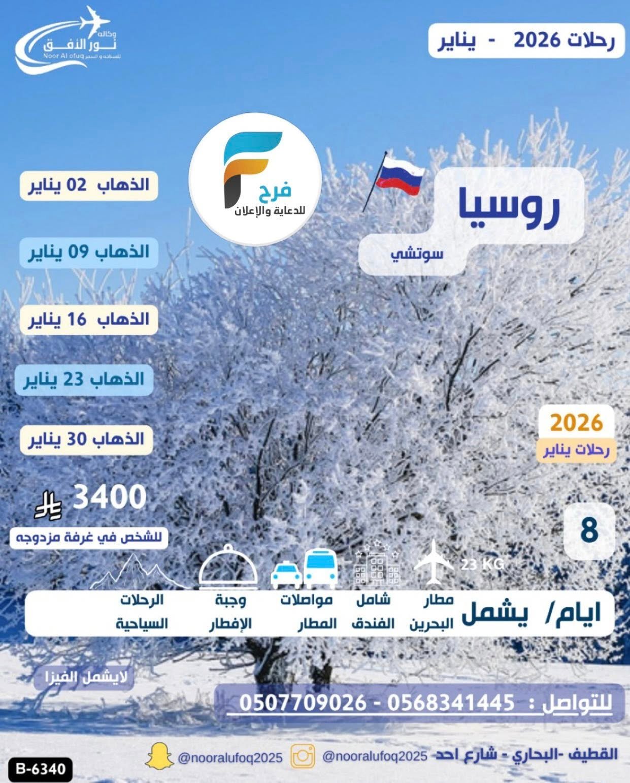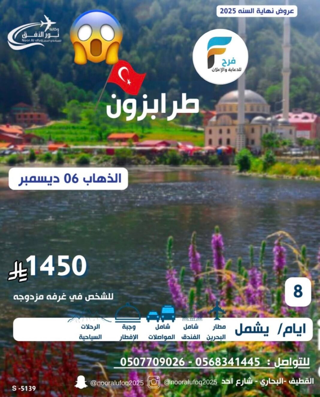 1450 ريال تبدأ رحلات وكالة نور الافق للسياحة والسفر إجازة الربيع / تركيا – روسيا – قرغيزستان – ماليزيا – جورجيا – كازاخستان 27 نوفمبر، 20251للحجز و الاستفسار :05683414450507709026: سناب شاتhttps://www.snapchat.com : الانستقرامhttps://www.instagram.com/أشترك معنا في خدمة فرح :