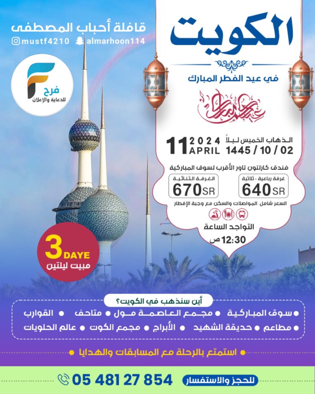 رحلة قافلة أحباب المصطفى (ص) إجازة العيد / الكويت 1 أبريل، 2024 1 لتواصل والحجز:- 0548127854 أشترك معنا في خدمة فرح : Enter the text or HTML code here شارك هذا الموضوع: النقر للمشاركة على X (فتح في نافذة جديدة) X انقر للمشاركة على فيسبوك (فتح في نافذة جديدة) فيس بوك معجب بهذه:إعجاب تحميل... مرتبط