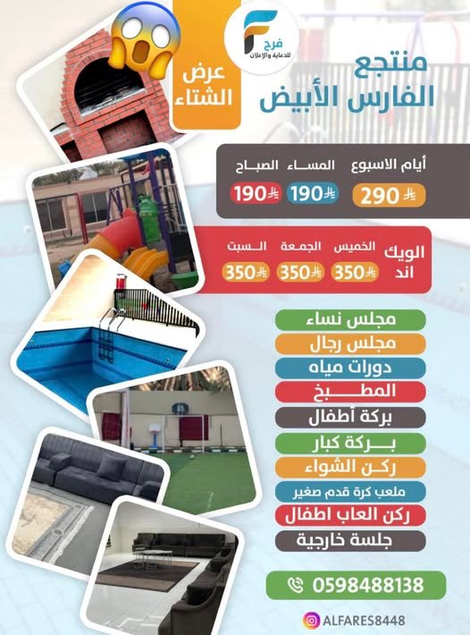 190 ريال تبدأ عروض الشتاء منتجع الفارس الابيض للإيجار اليومي 4 فبراير، 2026لم 1للحجز و الاستفسار :0598488138 : الانستقرام www.instagram.comأشترك معنا في خدمة فرح :
