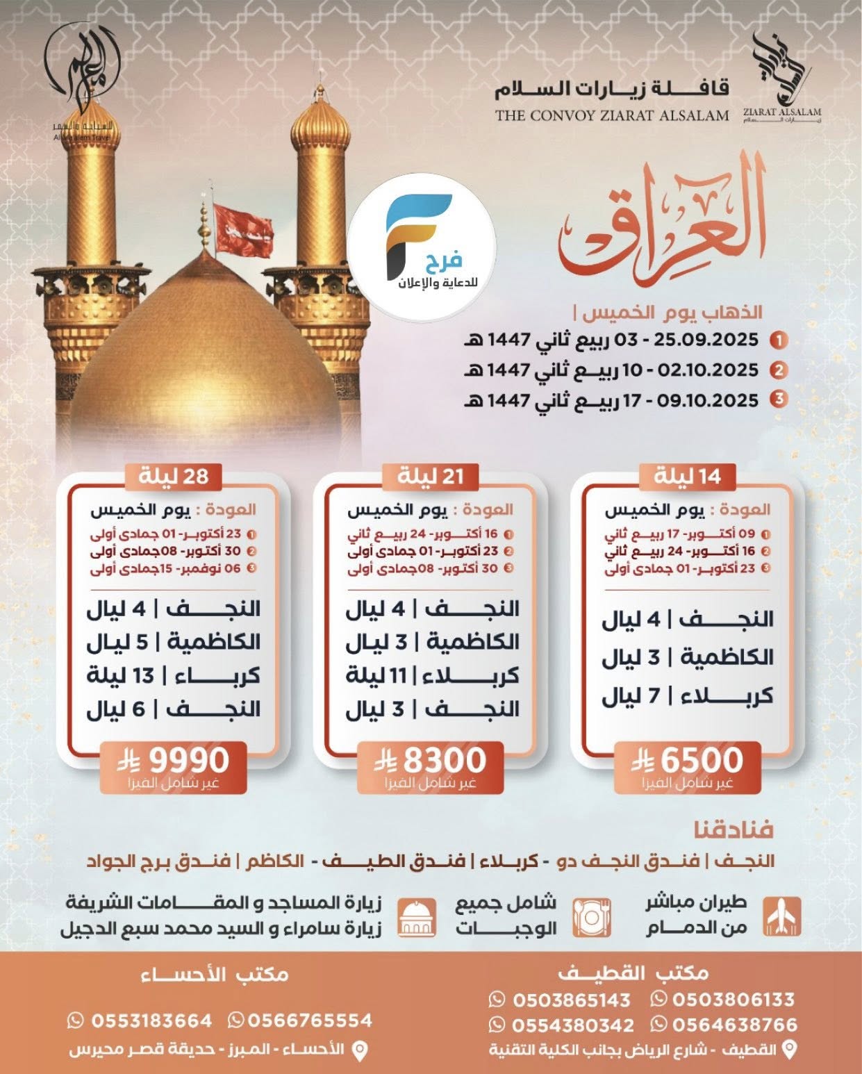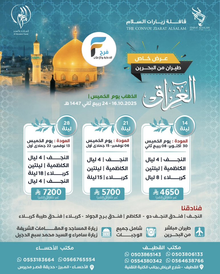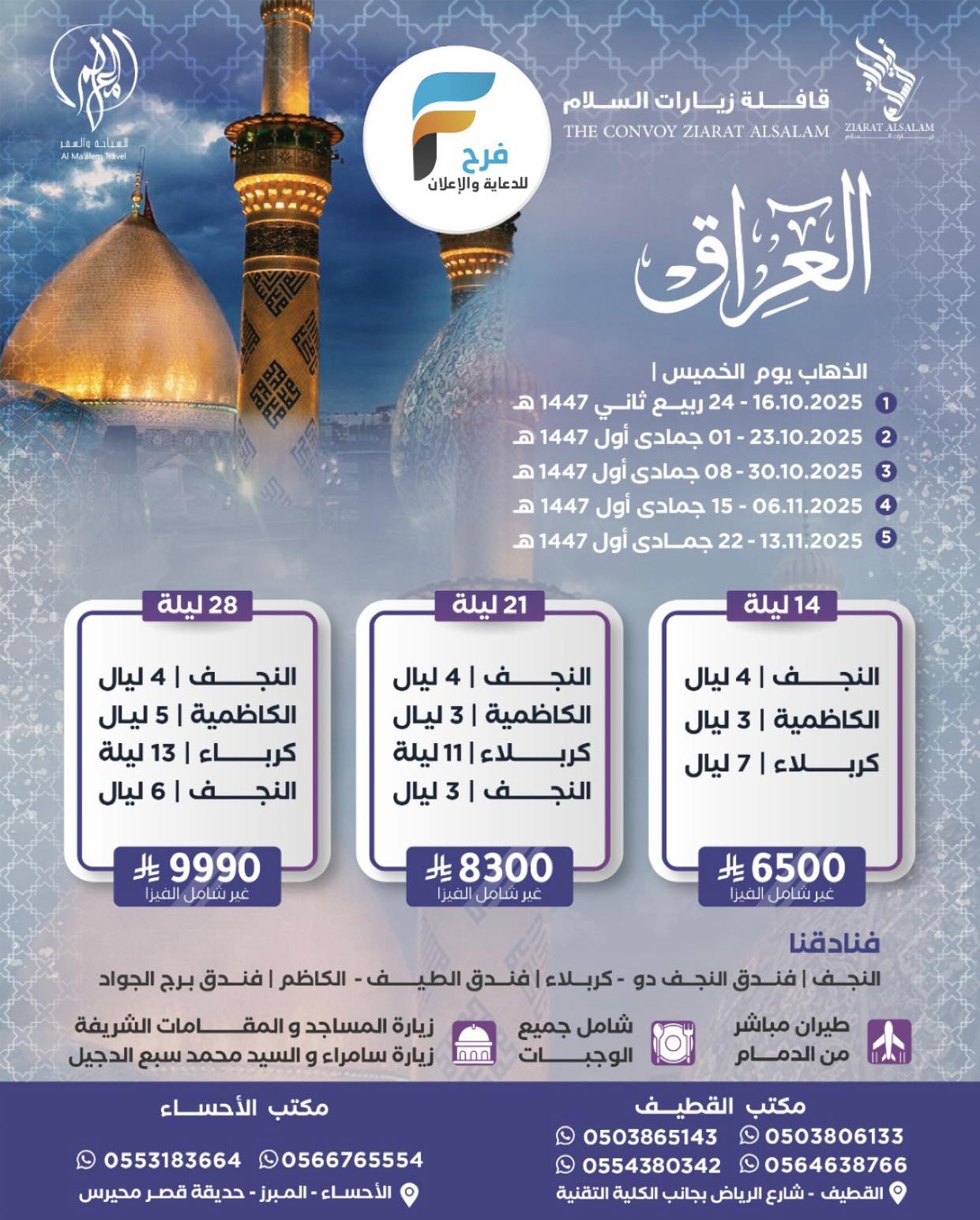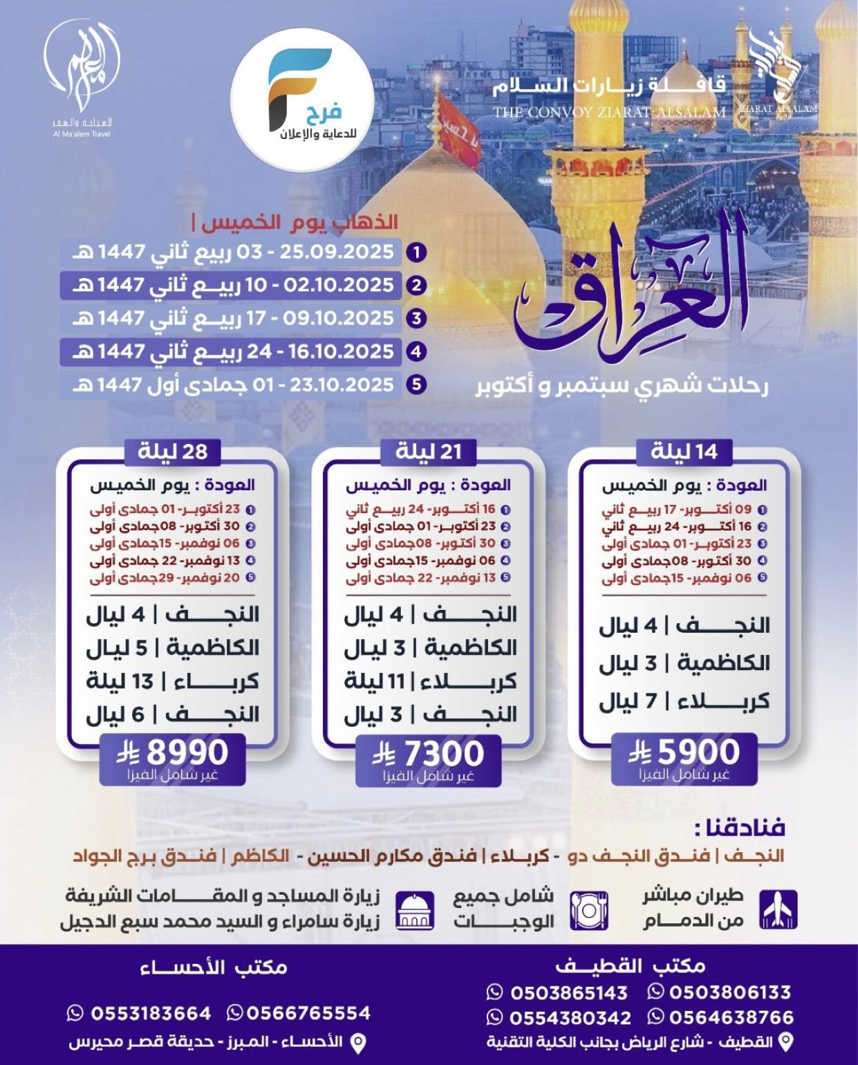 2450 ريال تبدأ رحلات قافلة زيارات السلام / العراق 28 سبتمبر، 2025 لم 5 للحجز أو الاستفسار : مكتب القطيف: 0503865143 0566149091 0566148151 0558762640 0503806133 0554380342 0564638766 0594267042 0538263916 مكتب الاحساء: 0553183664 0566765554 الانستقرام : https://www.instagram.com/ أشترك معنا في خدمة فرح : Enter the text or HTML code here شارك هذا الموضوع: النقر للمشاركة على X (فتح في نافذة جديدة) X انقر للمشاركة على فيسبوك (فتح في نافذة جديدة) فيس بوك معجب بهذه:إعجاب تحميل... مرتبط