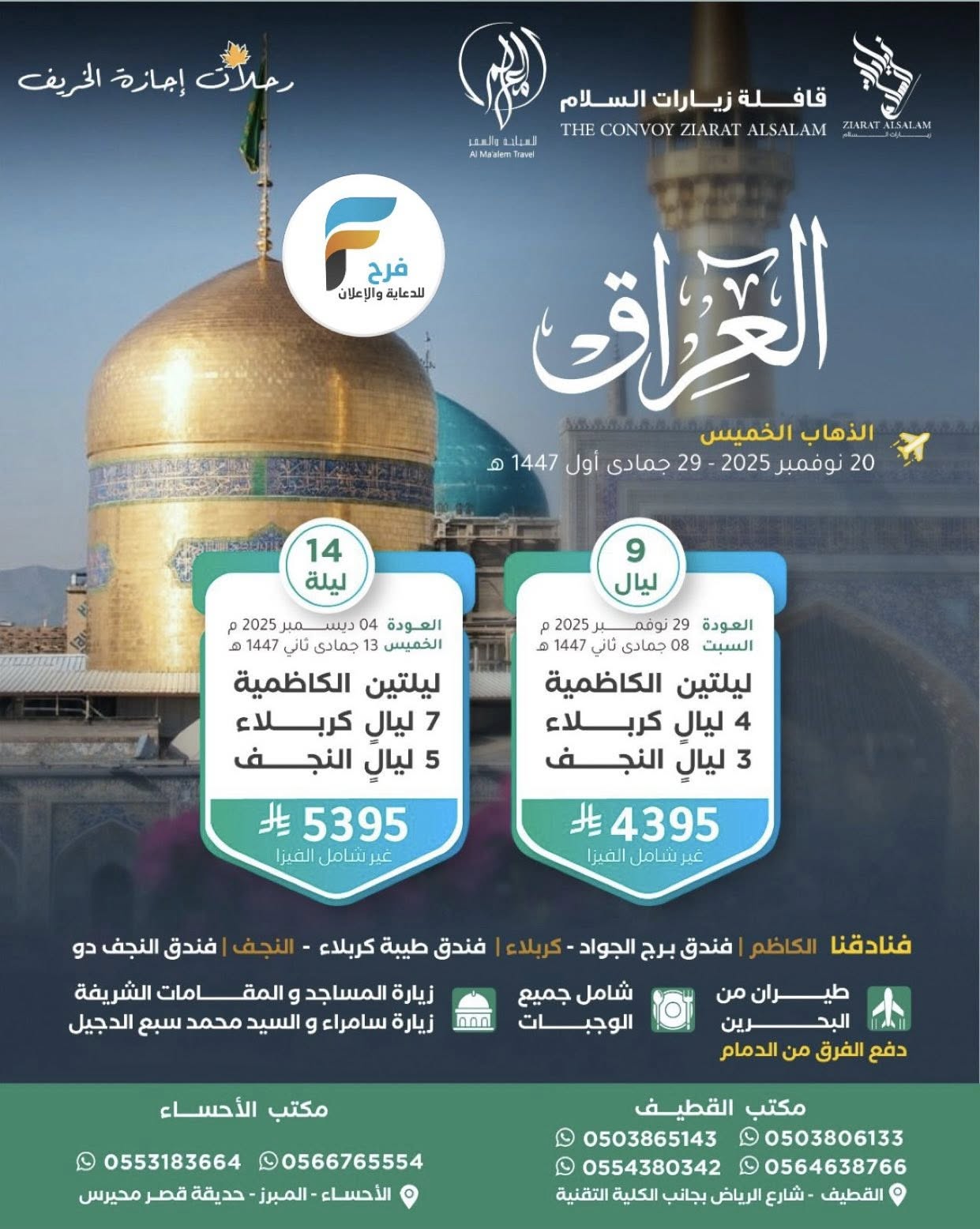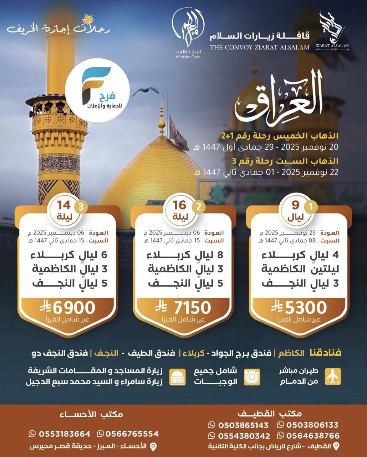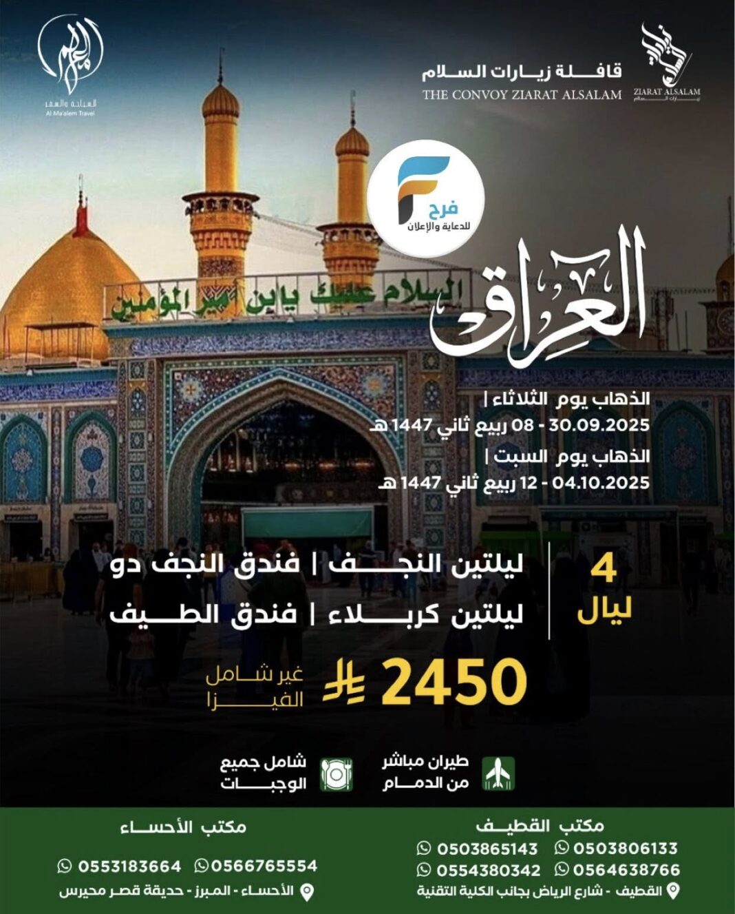2450 ريال تبدأ رحلات قافلة زيارات السلام / العراق 28 سبتمبر، 2025 لم 5 للحجز أو الاستفسار : مكتب القطيف: 0503865143 0566149091 0566148151 0558762640 0503806133 0554380342 0564638766 0594267042 0538263916 مكتب الاحساء: 0553183664 0566765554 الانستقرام : https://www.instagram.com/ أشترك معنا في خدمة فرح : Enter the text or HTML code here شارك هذا الموضوع: النقر للمشاركة على X (فتح في نافذة جديدة) X انقر للمشاركة على فيسبوك (فتح في نافذة جديدة) فيس بوك معجب بهذه:إعجاب تحميل... مرتبط