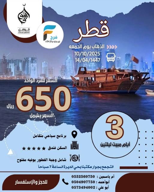 رحلة قوافل للسفر والسياحة / قطر 4 أكتوبر، 20251للحجز والاستفسار :-أم ياسمين: 0552560750أبو أحمد: 0504907750أبو علي: 0573494002أشترك معنا في خدمة فرح :