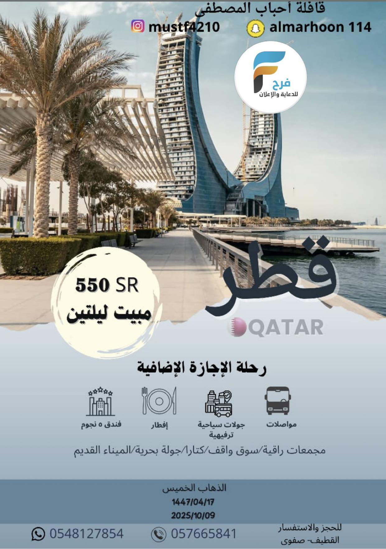 550 ريال رحلة قافلة احباب المصطفى (ص) الإجازة المطولة / قطر 2 أكتوبر، 2025 لم 1 لتواصل والحجز:- 0548127854 0576659841 أشترك معنا في خدمة فرح : Enter the text or HTML code here شارك هذا الموضوع: النقر للمشاركة على X (فتح في نافذة جديدة) X انقر للمشاركة على فيسبوك (فتح في نافذة جديدة) فيس بوك معجب بهذه:إعجاب تحميل... مرتبط