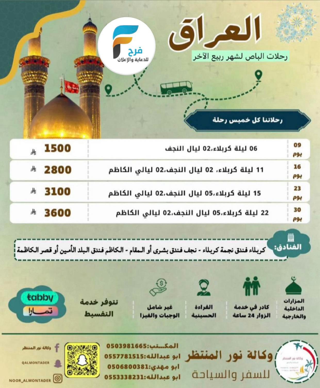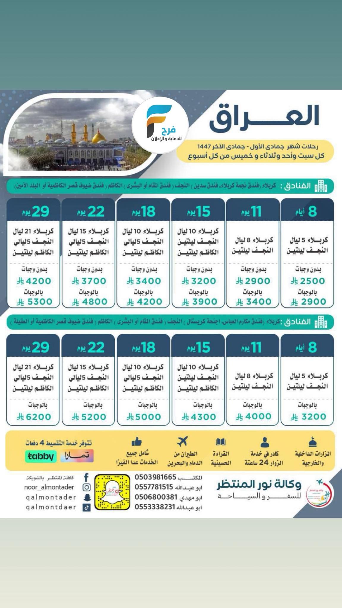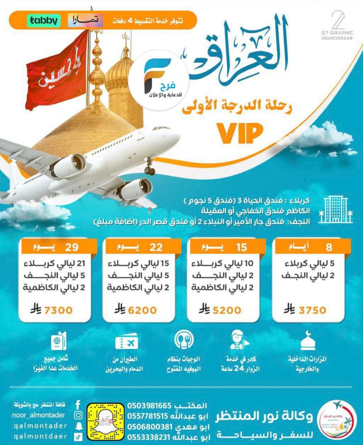 390 ريال تبدأ رحلات الحافلات والطيران قافلة المنتظر عج / مكة المكرمة – العراق 30 نوفمبر، 2025 1 للحجز والاستفسار تواصل مع مكتب الحجوزات بالشويكة القطيف – شارع الرياض مقابل مطعم الحسين في الشارع الثاني ولتصلك عروضنا احفظ الرقم وأرسل كلمة اشتراكوتساب 0557781515 للحجز والاستفسار : المكتب0138522277 الجوال0557781515050398166505533382310506800381 زورو صفحتنا ع الفيس بوكFacebook:http://goo.gl/MWwgEWInstgram:http://goo.gl/EaUD7M أضفني على Snapchat! المستخدم: qalmontaderhttps://www.snapchat.com أشترك معنا في خدمة فرح : شارك هذا الموضوع: النقر للمشاركة على X (فتح في نافذة جديدة) X انقر للمشاركة على فيسبوك (فتح في نافذة جديدة) فيس بوك معجب بهذه:إعجاب تحميل... مرتبط