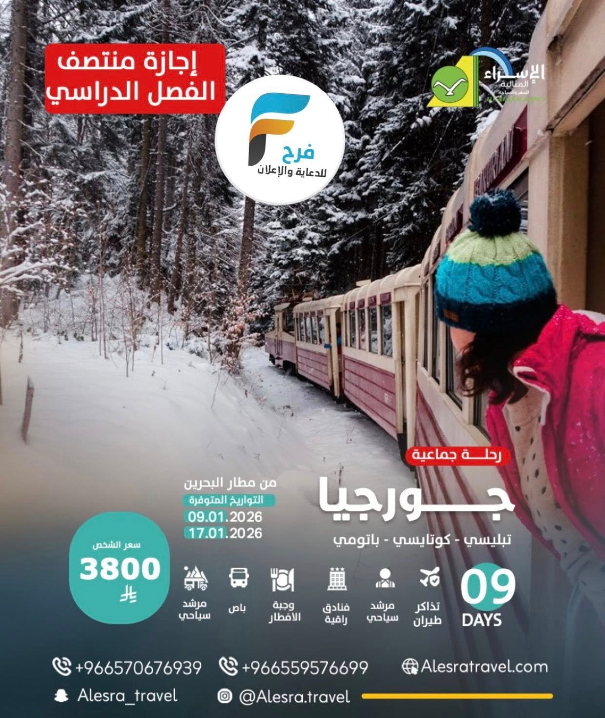 3350 ريال تبدأ رحلات وكالة الاسراء المثالية للسفر والسياحة إجازة منتصف الفصل/ تركيا – جورجيا – كازاخستان – تايلاند 7 ديسمبر، 2025 1 للحجز والإستفسار : 0570676939 0559576699 ♦ الانستقرام :-www.instagram.com ♦السناب :-www.snapchat.com أشترك معنا في خدمة فرح : شارك هذا الموضوع: النقر للمشاركة على X (فتح في نافذة جديدة) X انقر للمشاركة على فيسبوك (فتح في نافذة جديدة) فيس بوك معجب بهذه:إعجاب تحميل... مرتبط
