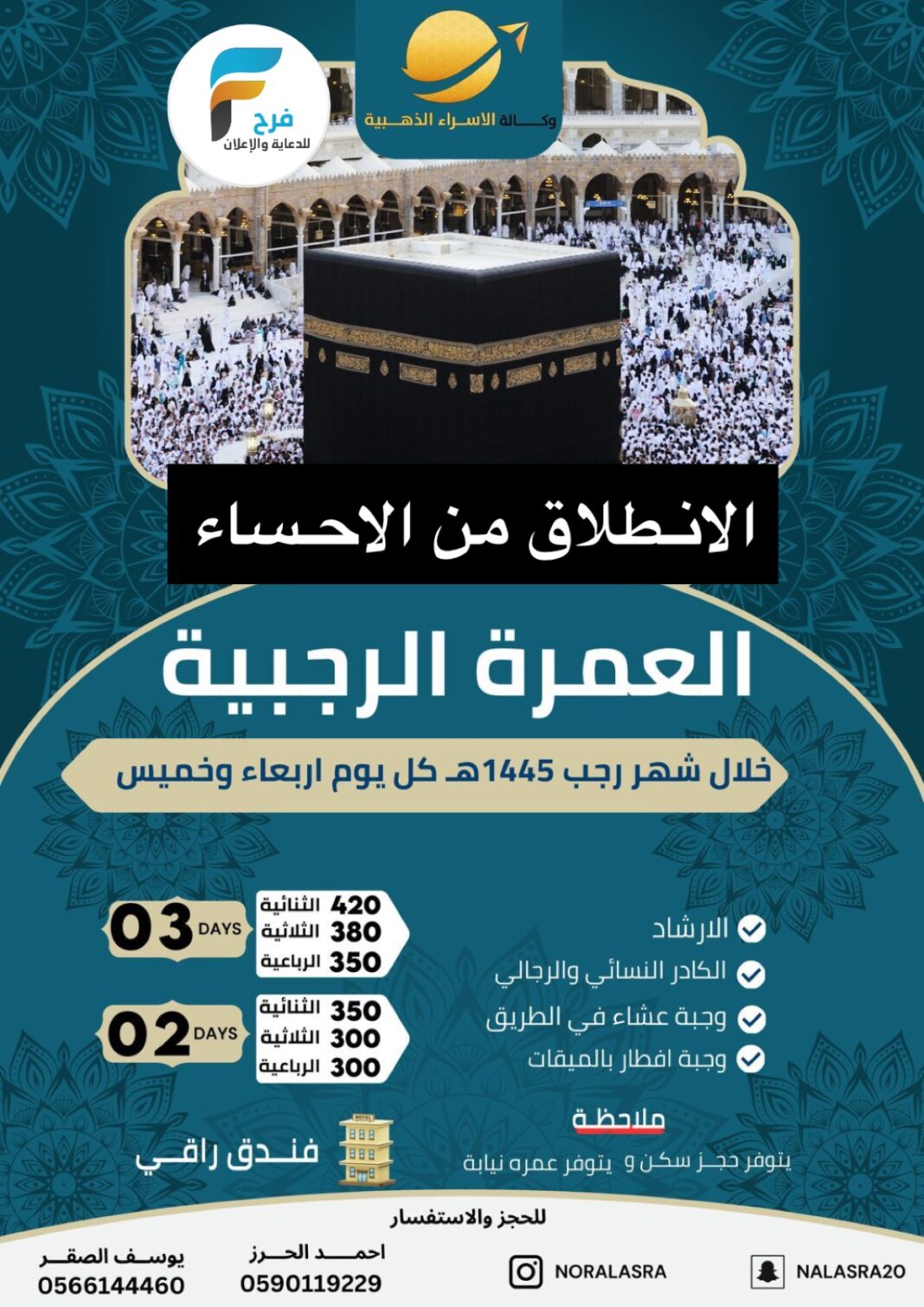 300 ريال تبدأ رحلات وكالة الاسراء الذهبية / العمرة الرجبية 12 يناير، 2024 6 للحجز والاستفسار:- 0590118229 0566144460 0566916630 أشترك معنا في خدمة فرح : Enter the text or HTML code here شارك هذا الموضوع: النقر للمشاركة على X (فتح في نافذة جديدة) X انقر للمشاركة على فيسبوك (فتح في نافذة جديدة) فيس بوك معجب بهذه:إعجاب تحميل... مرتبط