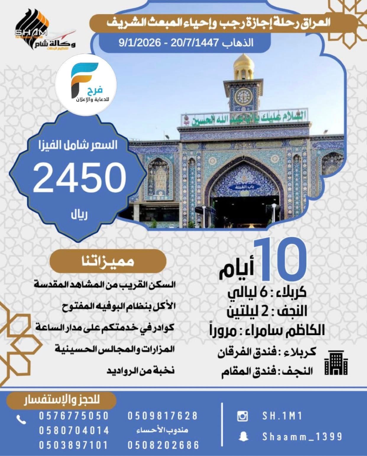 2250 ريال تبدأ رحلات الحافلات والطيران وكالة شام شهر جمادى الآخرة ورجب والإجازة / العراق 30 نوفمبر، 2025 325/08/16 للحجز والاستفسار : من القطيف0576775050 0580704014 0503897101 0509817628 من الأحساء0508202686 الانستقرام :https://www.instagram.com/ سناب شات:www.snapchat.com أشترك معنا في خدمة فرح : شارك هذا الموضوع: النقر للمشاركة على X (فتح في نافذة جديدة) X انقر للمشاركة على فيسبوك (فتح في نافذة جديدة) فيس بوك معجب بهذه:إعجاب تحميل... مرتبط