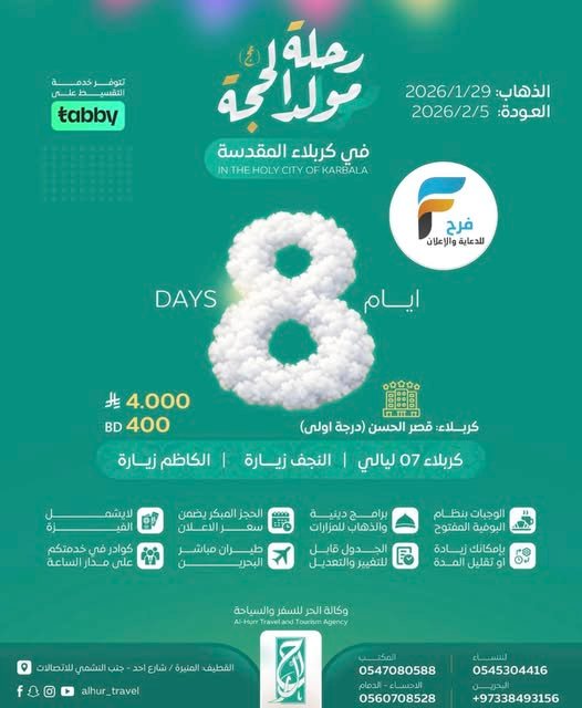رحلة وكالة الحر للسفر والسياحة مولد الحجة عج / العراق 21 يناير، 2026 125/10/01 للحجز أو الاستفسار : 0547080588 0545304416 0560708528 0097338493156 انستغرام :www.instgram.com سناب :www.snapchat.com أشترك معنا في خدمة فرح :