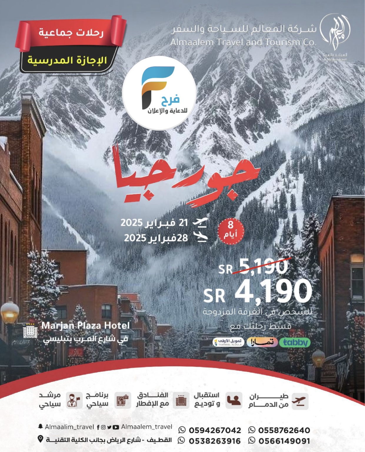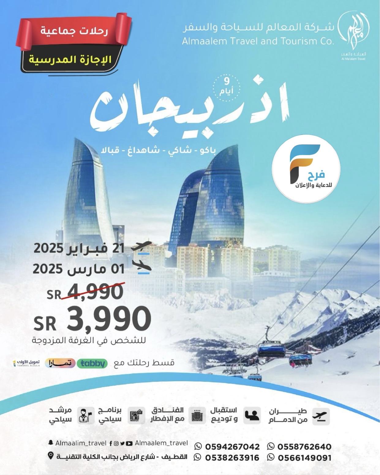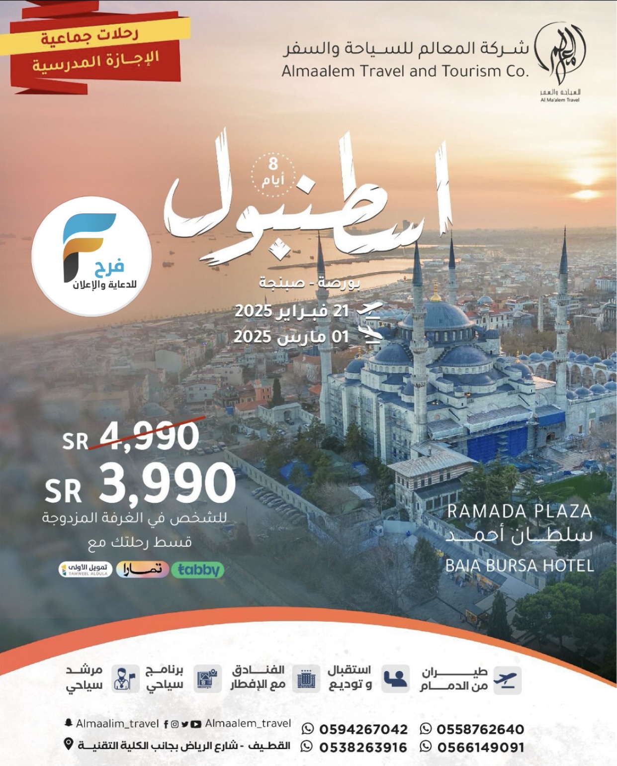 750 ريال تبدأ رحلات المعالم للسياحة والسفر / الكويت – اذربيجان – مصر – جورجيا – تركيا 19 فبراير، 2025 4 للحجز أو الاستفسار : 0594267042 0503865143 0503806133 0558762640 0554380342 0538263916 0564638766 الانستقرام : https://www.instagram.com/ أشترك معنا في خدمة فرح : Enter the text or HTML code here شارك هذا الموضوع: النقر للمشاركة على X (فتح في نافذة جديدة) X انقر للمشاركة على فيسبوك (فتح في نافذة جديدة) فيس بوك معجب بهذه:إعجاب تحميل... مرتبط