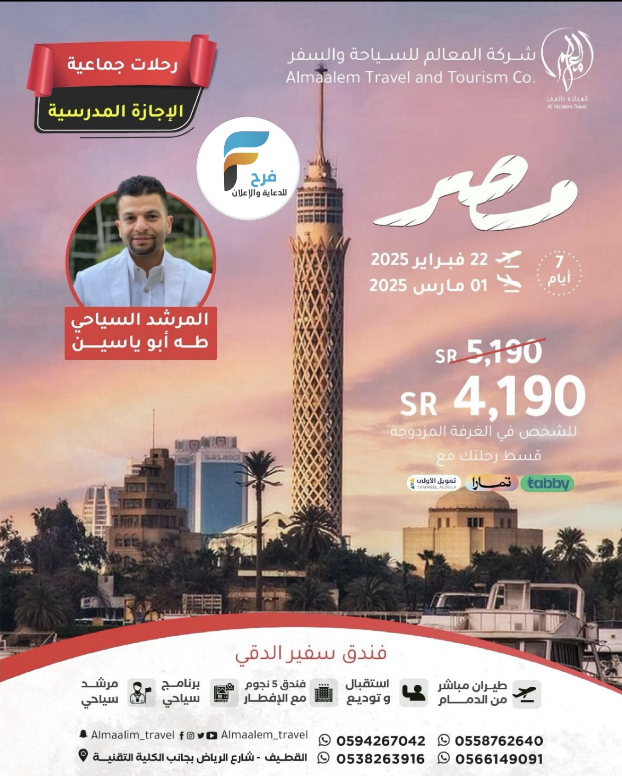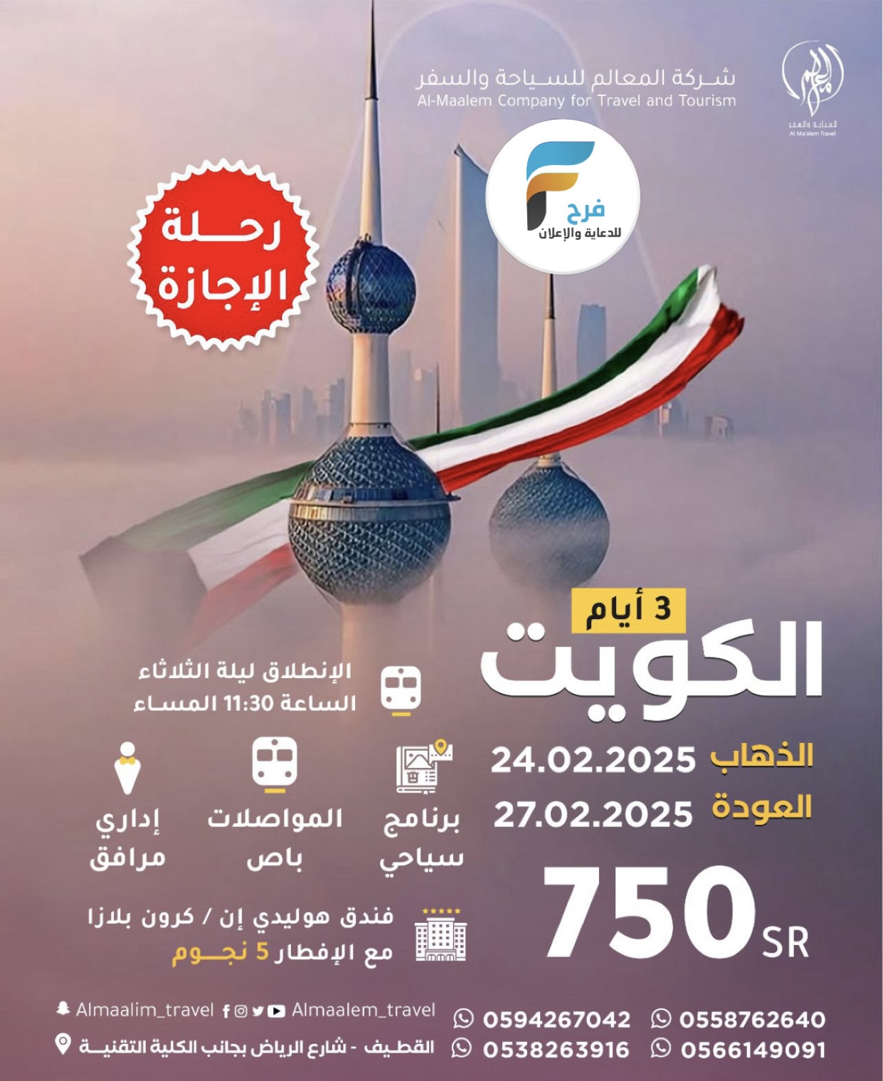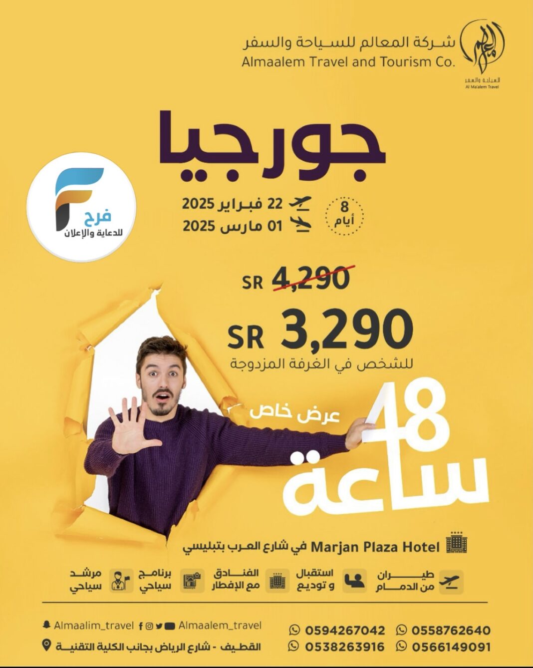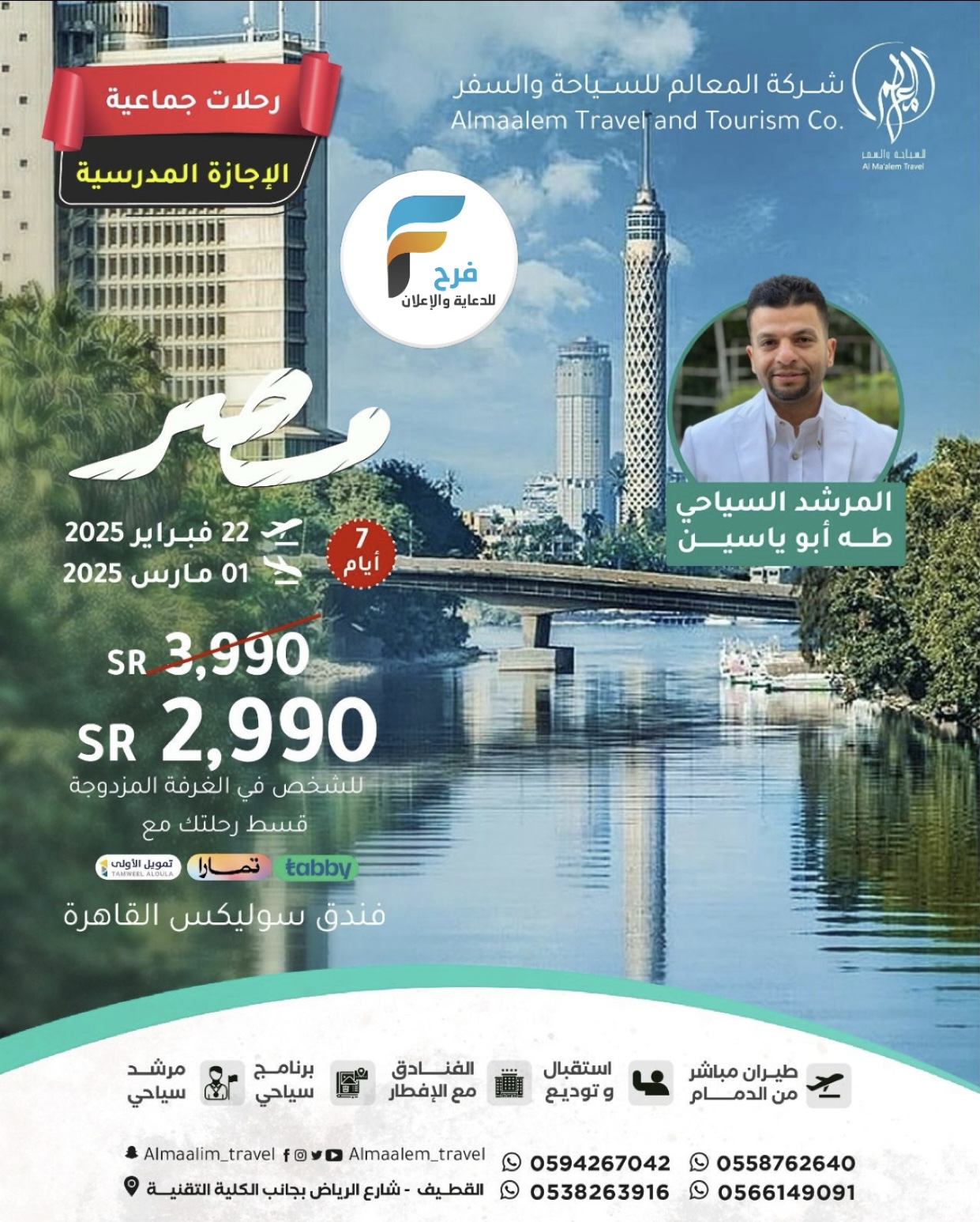 750 ريال تبدأ رحلات المعالم للسياحة والسفر / الكويت – اذربيجان – مصر – جورجيا – تركيا 19 فبراير، 2025 4 للحجز أو الاستفسار : 0594267042 0503865143 0503806133 0558762640 0554380342 0538263916 0564638766 الانستقرام : https://www.instagram.com/ أشترك معنا في خدمة فرح : Enter the text or HTML code here شارك هذا الموضوع: النقر للمشاركة على X (فتح في نافذة جديدة) X انقر للمشاركة على فيسبوك (فتح في نافذة جديدة) فيس بوك معجب بهذه:إعجاب تحميل... مرتبط