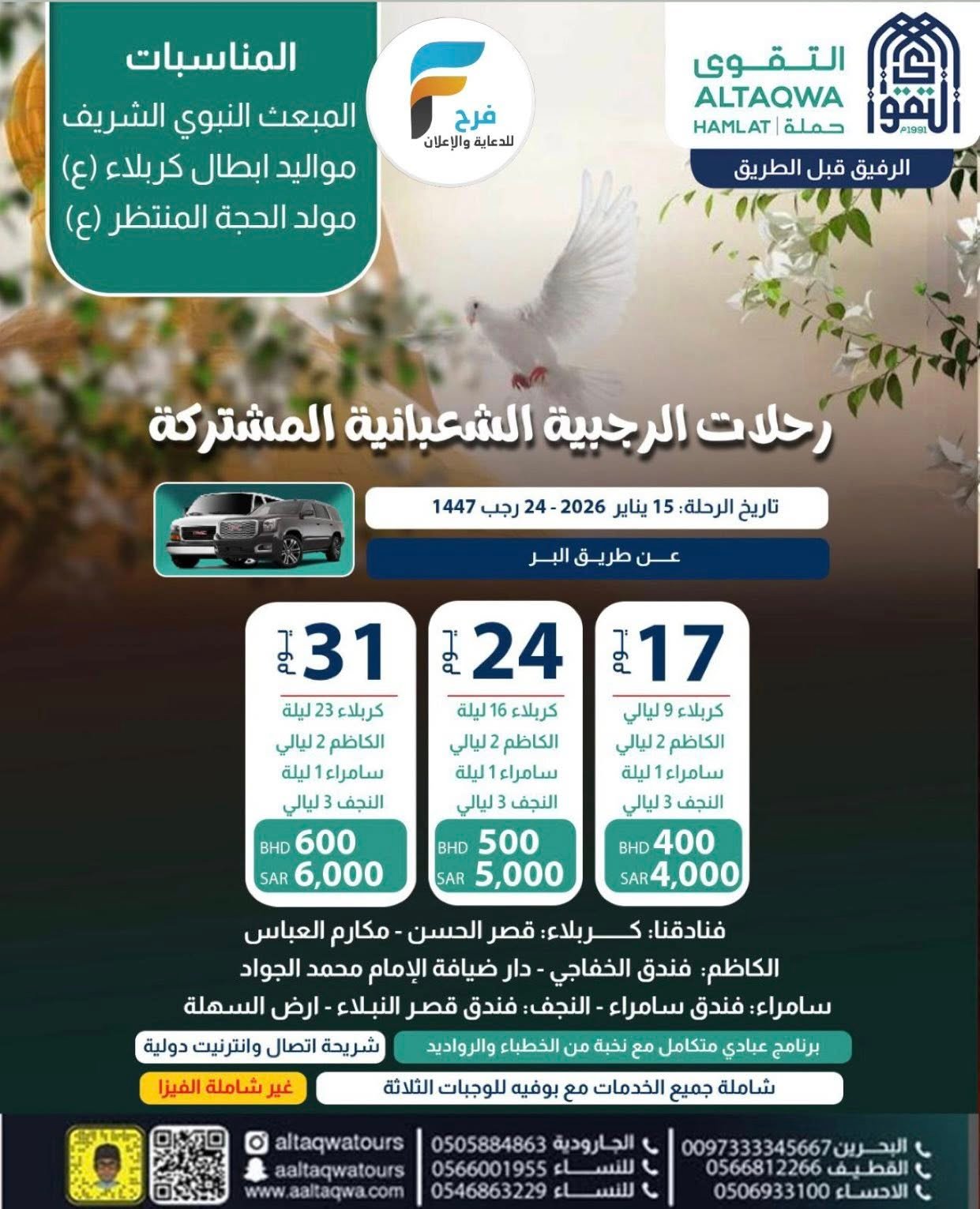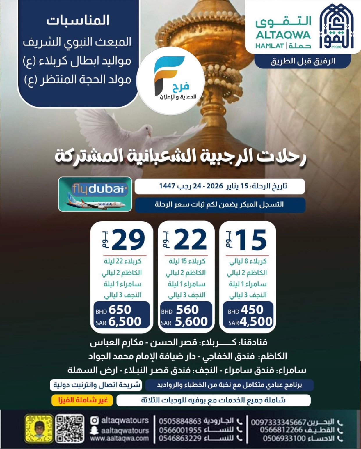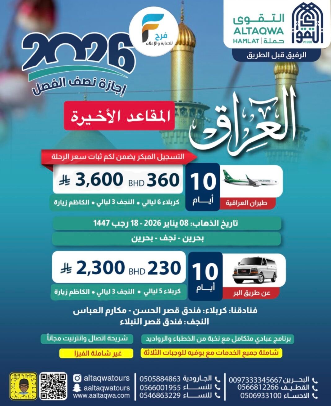 2300 ريال تبدأ رحلات الحافلات والطيران التقوى للسفر والسياحة شهري رجب وشعبان / العراق 18 ديسمبر، 2025425/08/14للحجز أو الاستفسار :-القطيف:0566812266الإنستقرام :-www.instagram.comأشترك معنا في خدمة فرح :
