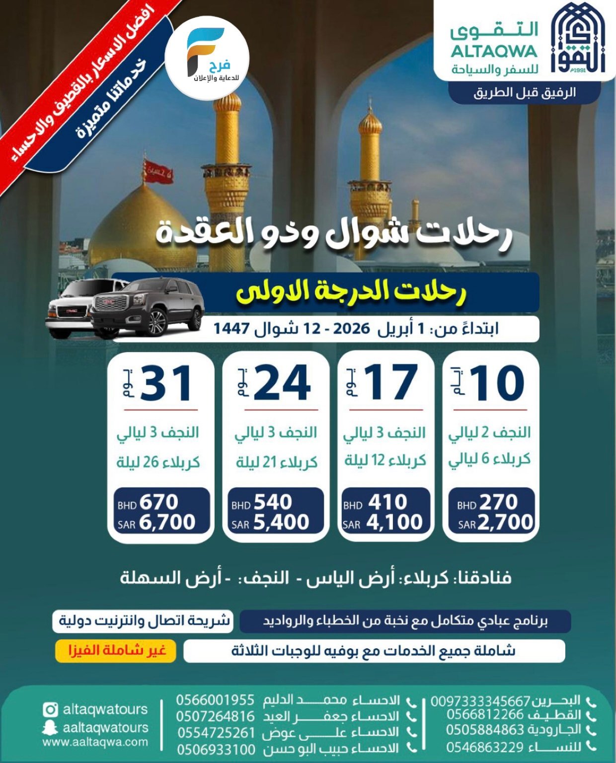 2300 ريال تبدأ رحلات برية التقوى للسفر والسياحة / العراق 30 مارس، 20261 25/08/14للحجز أو الاستفسار :-القطيف: 0566812266الإنستقرام :- www.instagram.comأشترك معنا في خدمة فرح :