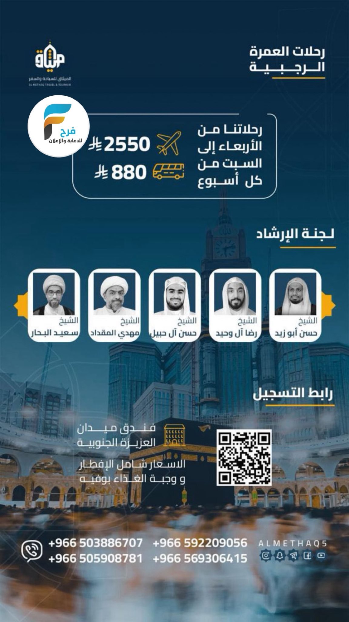 880 ريال تبدأ رحلات الطيران والحافلات الميثاق للسياحة والسفر / العمرة الرجبية 17 ديسمبر، 2025525/12/19💐 ميثاقي تعاهدتهالإدارة تحت إشراف / الاستاذ هاني المعاتيق ابوميثم ☎0505908781☎0592209056☎ 0552042195☎0503886707☎0569306415☎ 0138230666➖➖➖➖➖➖➖نحن معرّفون في جميع قنواتنا بــalmethaq5(سناب – فيس بوك – انستقرام )✍ التزامنا ميثاقأشترك معنا في خدمة فرح :