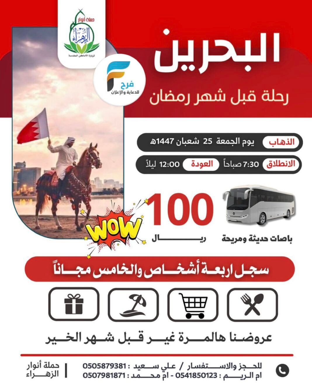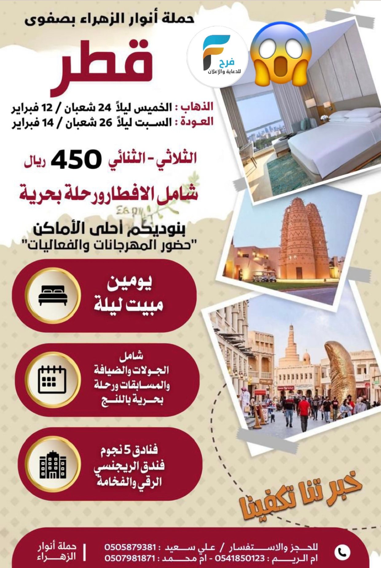100 ريال تبدأ رحلات حملة انوار الزهراء / قطر _ البحرين 10 فبراير، 20261للحجز و الاستفسار : علي سعيد 0505879381للنساء ام ريم 0541850123حسين سعيد 0508841902ام محمد 0507981871ام ولاية 0591459830أشترك معنا في خدمة فرح :
