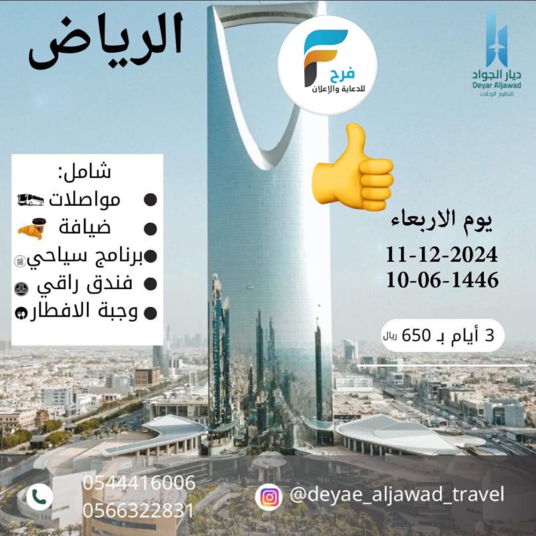 600 ريال تبدأ رحلات ديار الجواد شهر ديسمبر / الرياض – قطر – المدينة المنورة – العراق – اذربيجان – بولندا 1 ديسمبر، 2024 2 للحجز والاستفسار : 0566322831 0544416006 0542726577 0541310222 الانستقرام : www.instagram.com أشترك معنا في خدمة فرح : Enter the text or HTML code here شارك هذا الموضوع: النقر للمشاركة على X (فتح في نافذة جديدة) X انقر للمشاركة على فيسبوك (فتح في نافذة جديدة) فيس بوك معجب بهذه:إعجاب تحميل... مرتبط