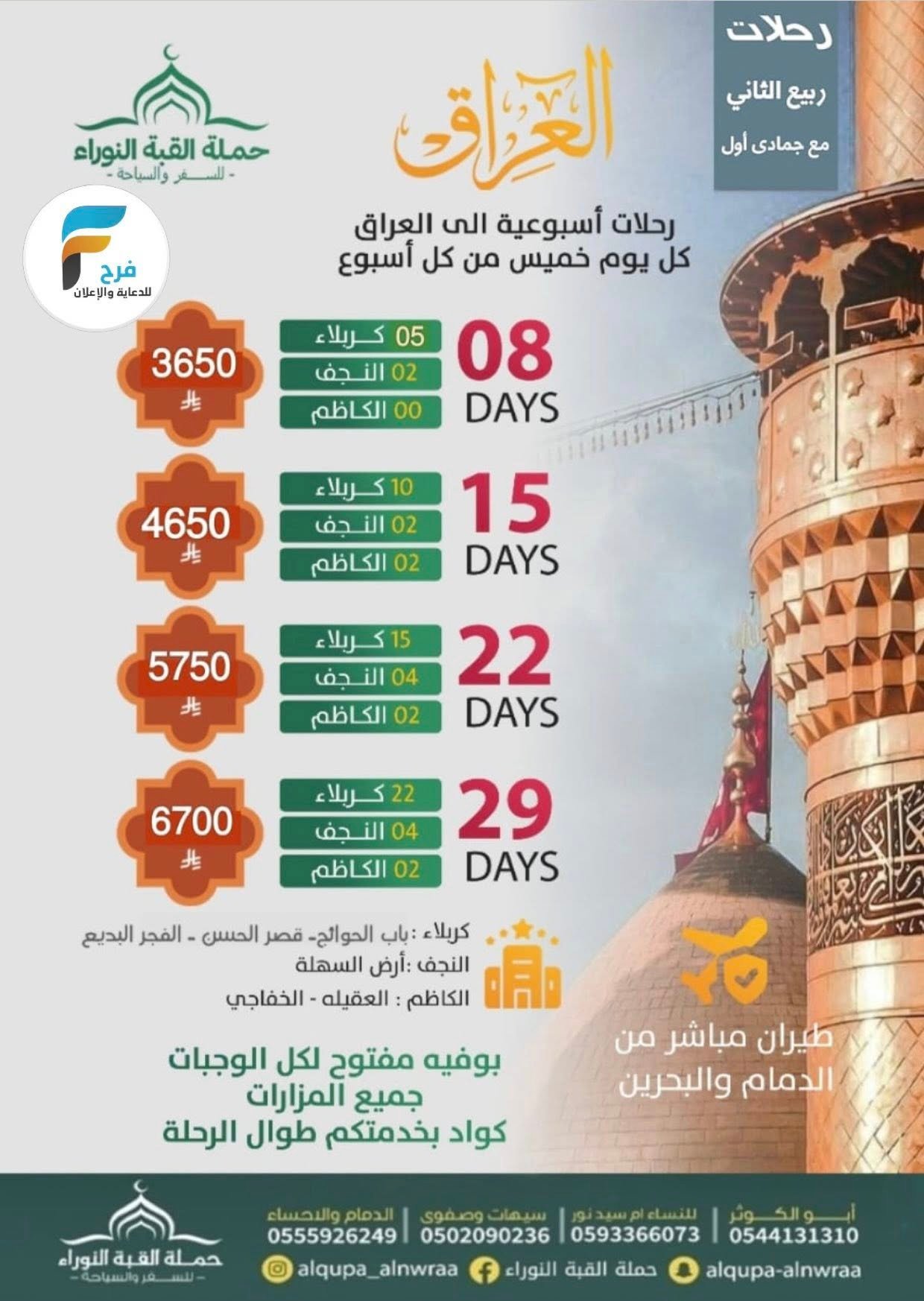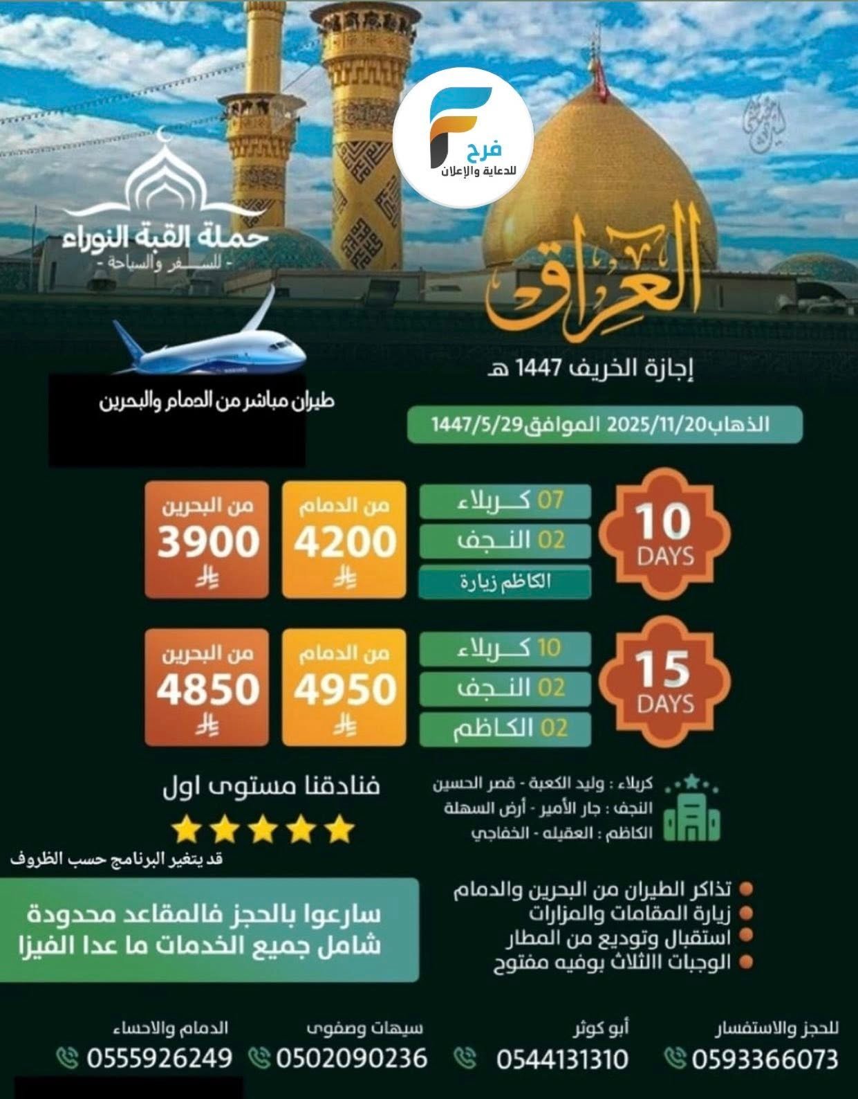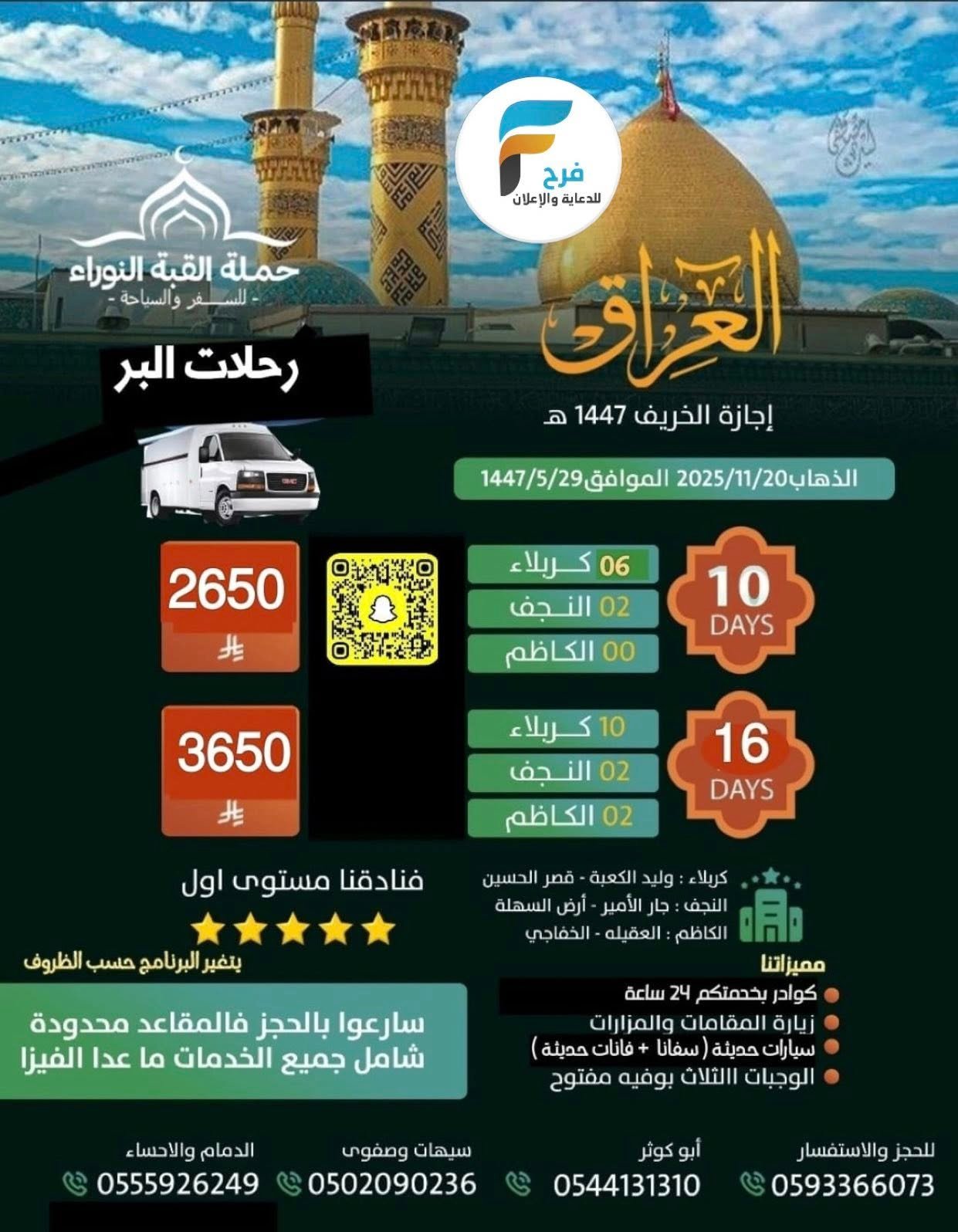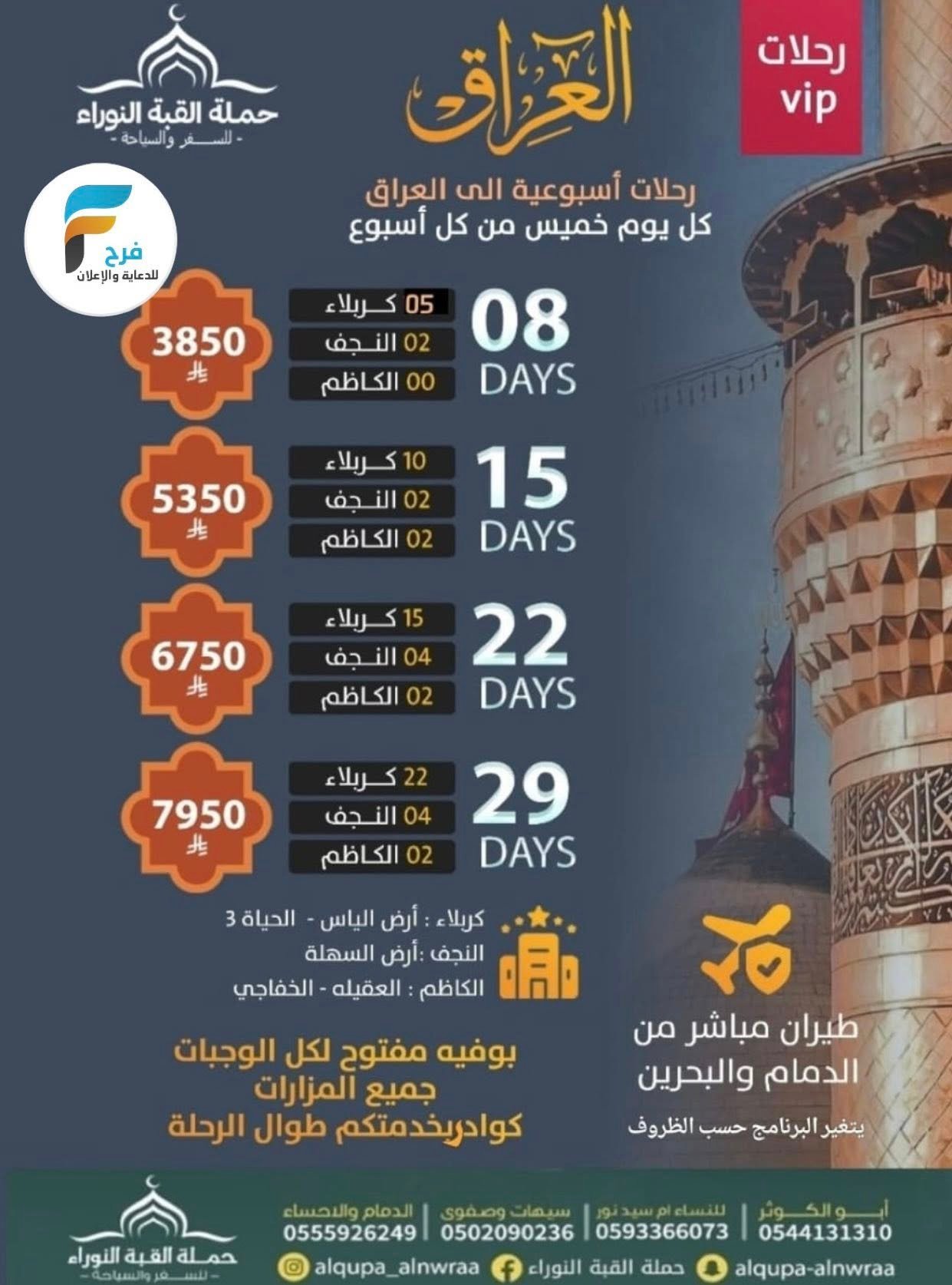 2650 ريال تبدأ رحلات الحافلات والطيران حملة القبة النوراء إجازة الخريف / العراق 21 أكتوبر، 202525/12/066ب ق 300🎆 للحجز والإستفسار : 🎆أم سيد نور 📱0593366073أبو الكوثر:📱0544131310سيهات وصفوى: 📱0502090236الدمام والأحساء: 📱0555926249📱0542145337المكتب: 📱0138204781أشترك معنا في خدمة فرح :