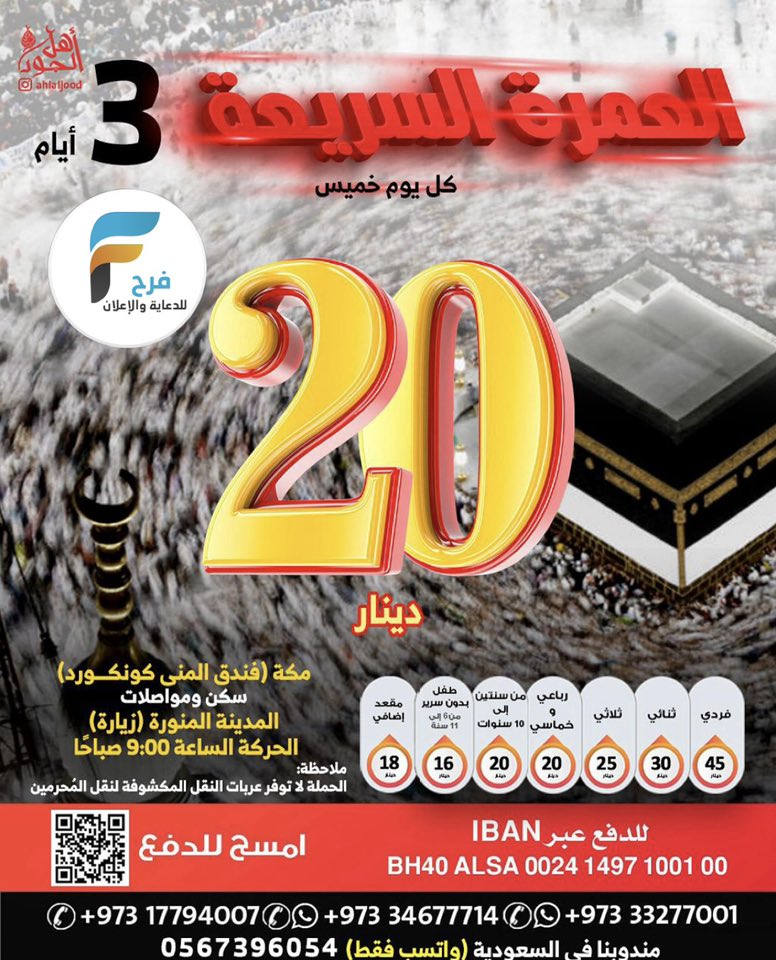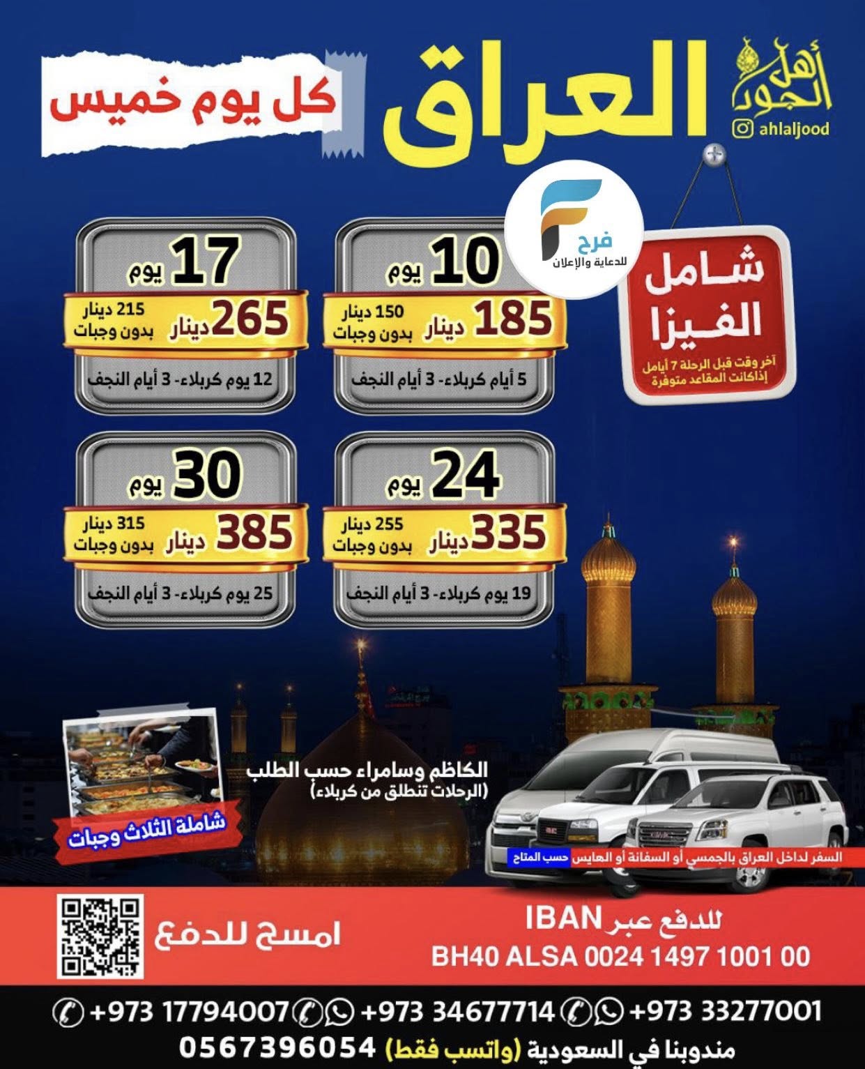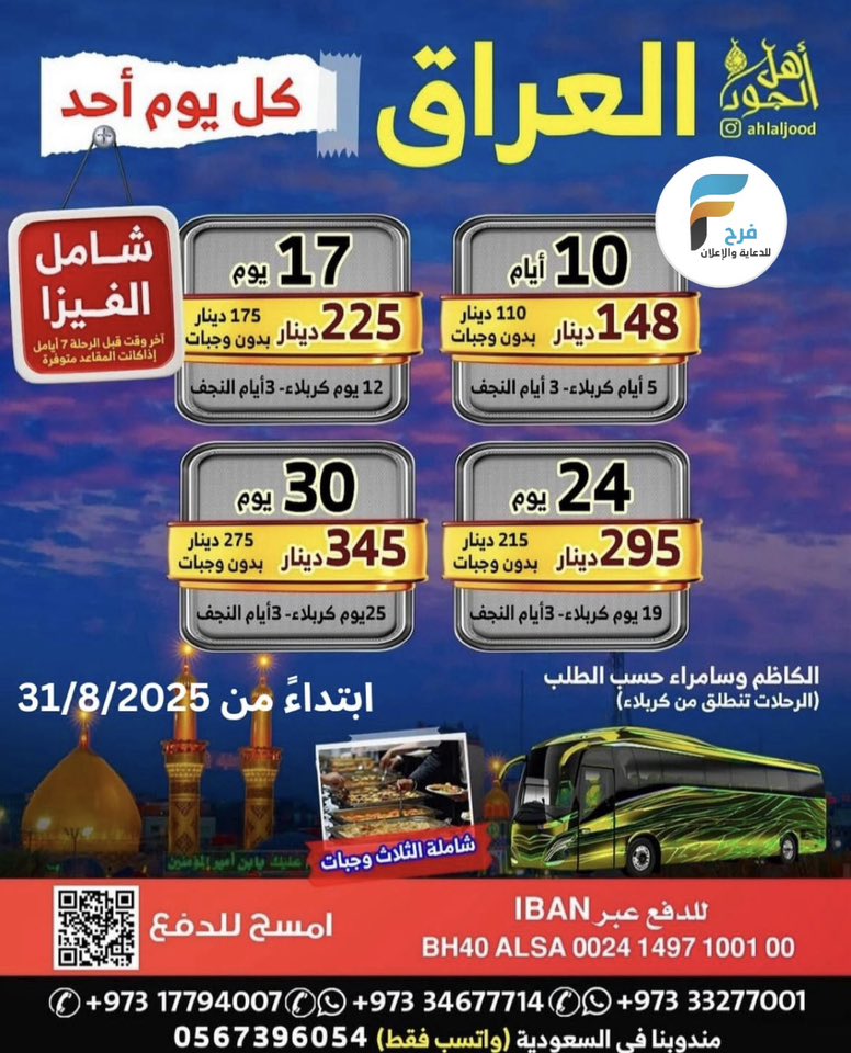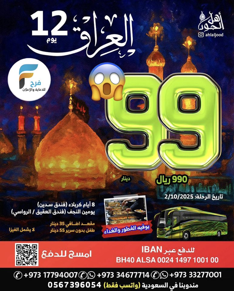 200 ريال تبدأ رحلات اهل الجود الأسبوعية / العراق – مكة المكرمة 22 سبتمبر، 2025 1 للحجز و الاستفسار : مندوبنا في السعودية 0567396054 0097333277714 0097333277001 0097317794007 0097334677714 : الانستقرام https://www.instagram.com/ أشترك معنا في خدمة فرح : Enter the text or HTML code here شارك هذا الموضوع: النقر للمشاركة على X (فتح في نافذة جديدة) X انقر للمشاركة على فيسبوك (فتح في نافذة جديدة) فيس بوك معجب بهذه:إعجاب تحميل... مرتبط