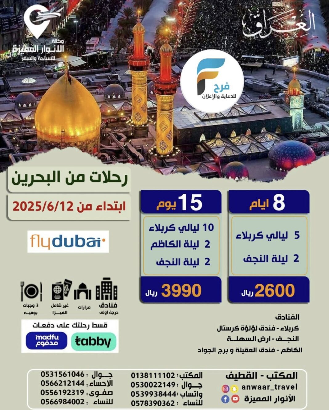 2600 ريال تبدأ رحلات وكالة الأنوار المميزة تبديل الراية وعشرة محرم / العراق 5 يونيو، 2025 لم 5 للحجز و الاستفسار : 0539938444 0530022149 0557771350 0138111102 للنساء :- 0578390362 0566984002 صفوى :- 0556192319 الاحساء :- 0566212144 0531561046 أشترك معنا في خدمة فرح : Enter the text or HTML code here شارك هذا الموضوع: النقر للمشاركة على X (فتح في نافذة جديدة) X انقر للمشاركة على فيسبوك (فتح في نافذة جديدة) فيس بوك معجب بهذه:إعجاب تحميل... مرتبط