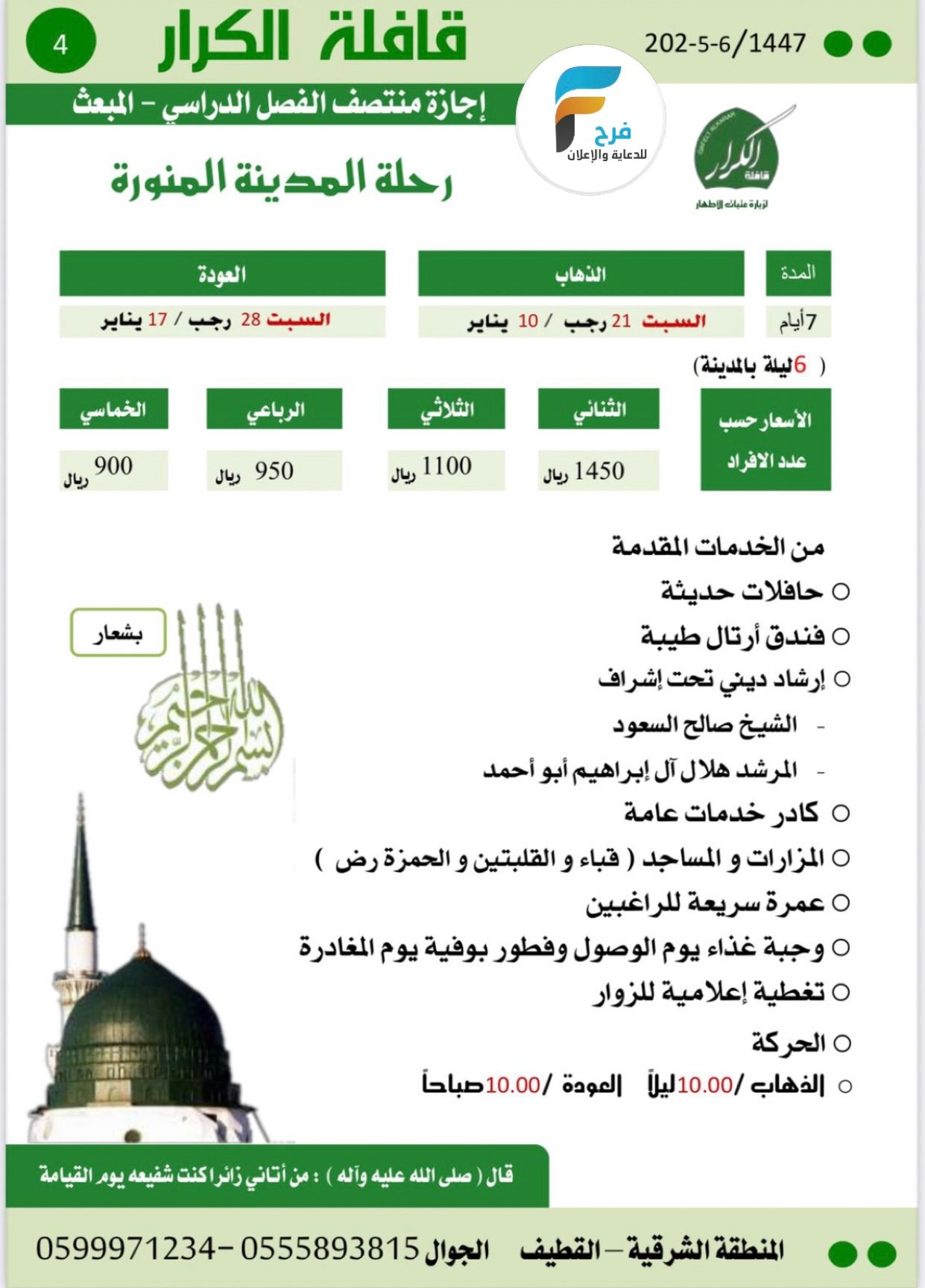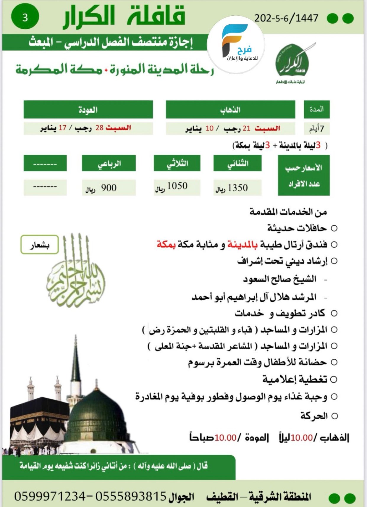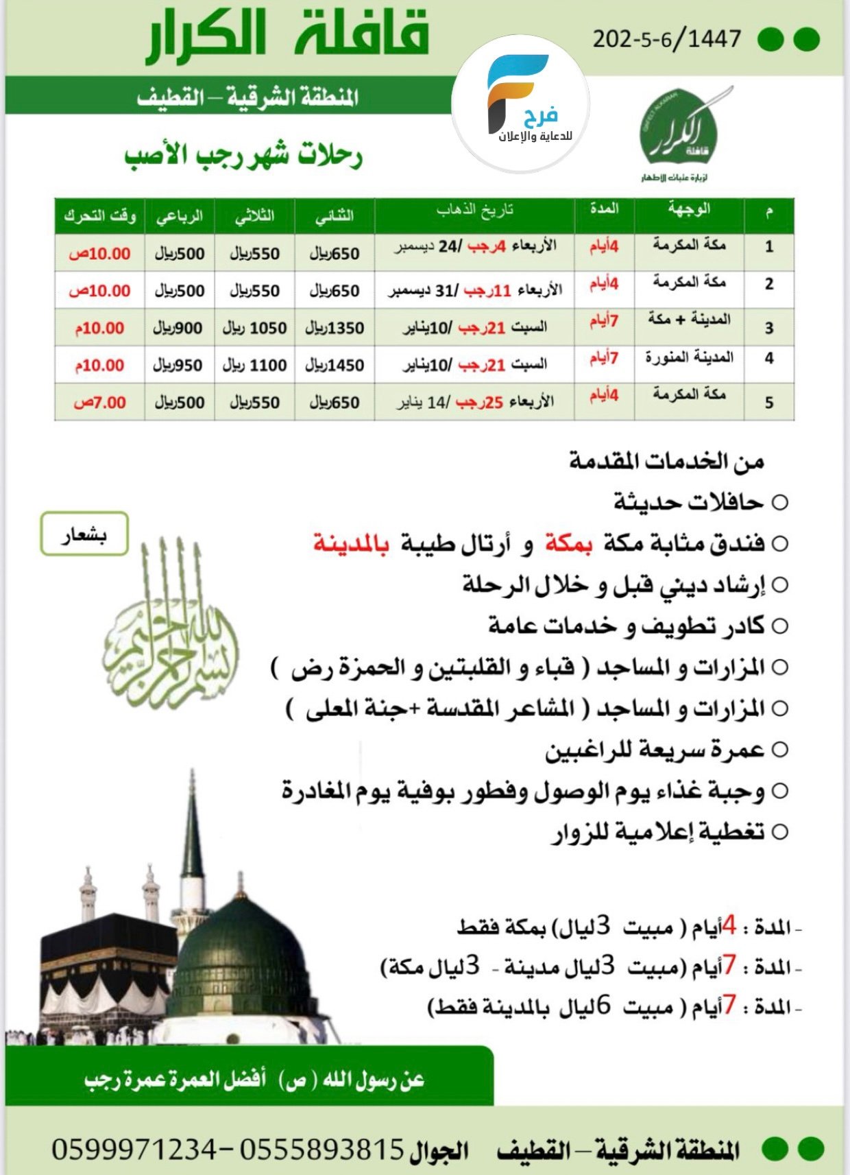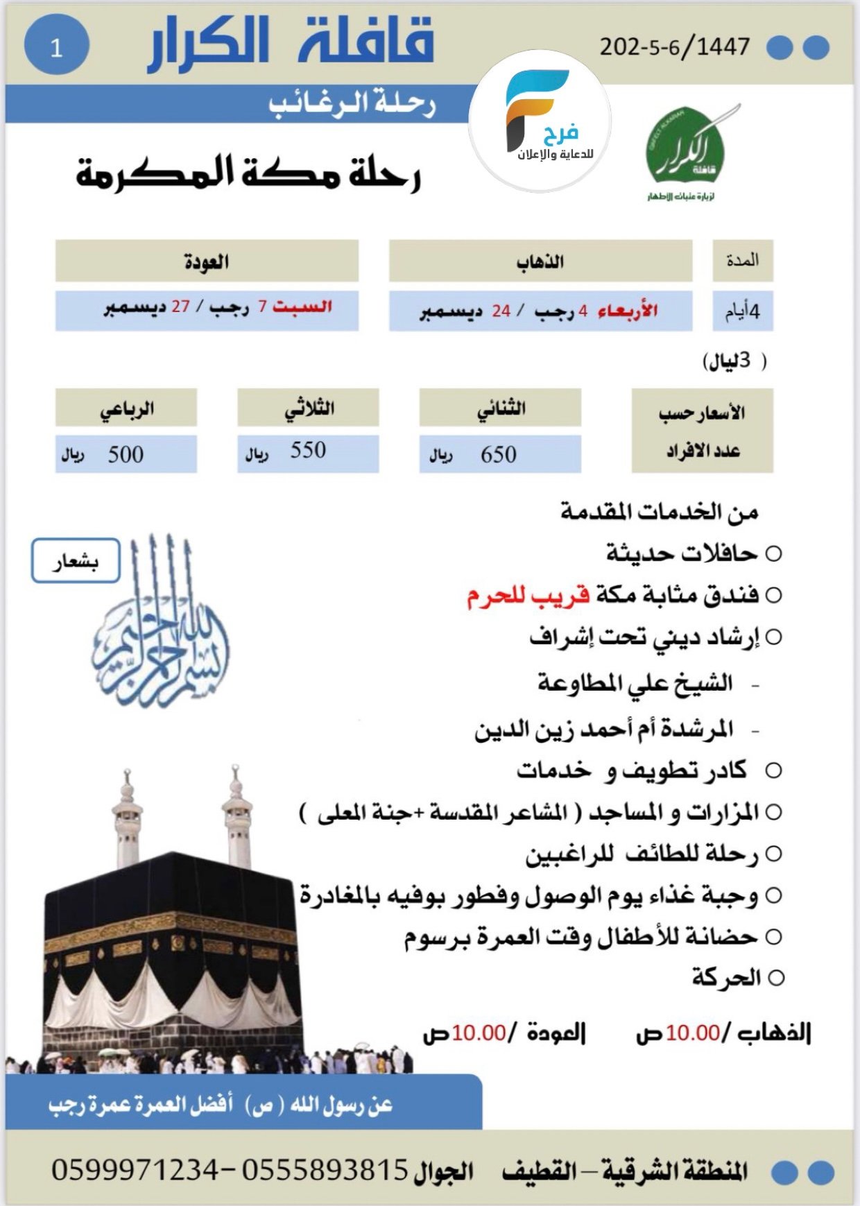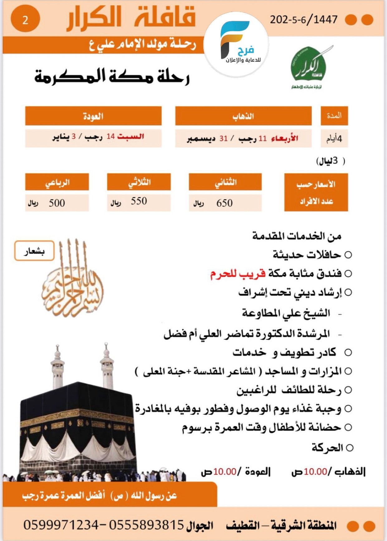 أيـ4ـام تبدأ رحلات قافلة الكرار / العمرة الرجبية والمدينة المنورة 15 ديسمبر، 2025325/09/12للحجز والإستفسار :-📱الجوال05558938150599971234أشترك معنا في خدمة فرح :