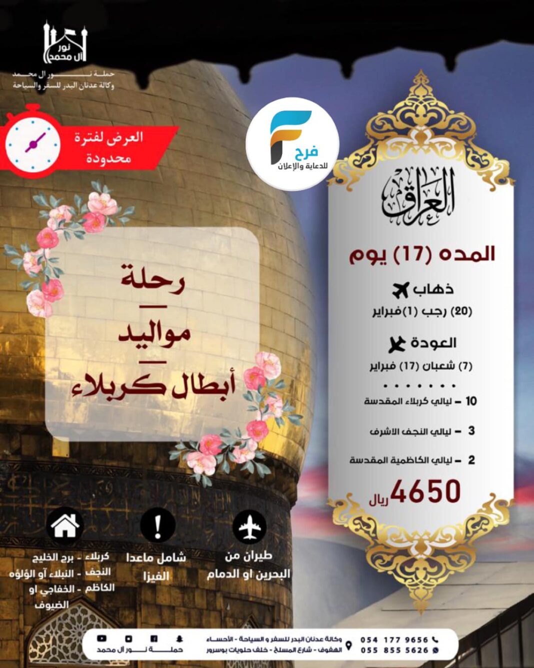 4650 ريال تبدأ رحلات حملة نور آل محمد مواليد أبطال كربلاء والزيارة الشعبانية / العراق 22 يناير، 2024 4 للحجز والاستفسار : الاحساء 0558555626 0541779656 القطيف والدمام 0541469941 الانستقرام :www.instagram.com أشترك معنا في خدمة فرح : Enter the text or HTML code here شارك هذا الموضوع: النقر للمشاركة على X (فتح في نافذة جديدة) X انقر للمشاركة على فيسبوك (فتح في نافذة جديدة) فيس بوك معجب بهذه:إعجاب تحميل... مرتبط